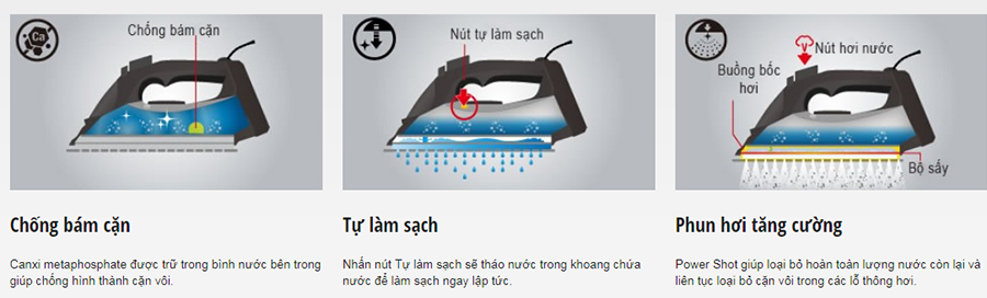 Bàn ủi Panasonic có chức năng chống nhỏ giọt và chế độ chống cặn, giúp ngăn không cho nước rò rỉ ra ngoài, không làm ố vàng quần áo, bằng cách khi nhiệt độ của bàn ủi giảm xuống đến một mức nhất định, bàn là sẽ tự động cấp nước để ngăn chặn rò rỉ từ các lỗ thông hơi. Và khả năng tự làm sạch thông minh, chỉ bằng 1 nút nhấn sẽ tự động tháo nước trong khoang chứa nước để làm sạch ngay lập tức.