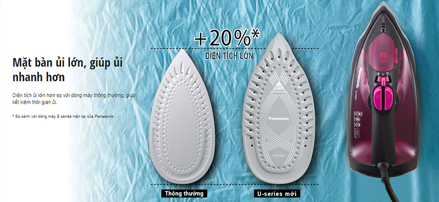 Ngoài ra, bản ủi Panasonic thích hợp với mọi loại vải, có vòng chỉnh nhiệt giúp lựa chọn được mức nhiệt độ phù hợp cho từng loại vải, đèn báo sẽ tự tắt khi đạt mức nhiệt cần thiết, bảo vệ quần áo không bị cháy xém do gặp phải nhiệt độ quá cao.