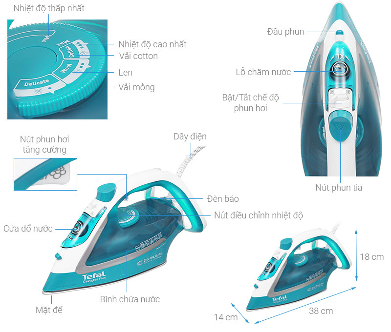 THÔNG TIN SẢN PHẨM Bàn ủi hơi nước Tefal FV1054L0 1200W (Màu Xanh) Đặc điểm nổi bật - Thiết kế nhỏ gọn, dễ di chuyển, hạn chế mỏi tay - Công suất 1200W làm nóng nhanh, tiết kiệm điện năng - Dung tích bình nước 180 ml ủi được nhiều quần áo cùng lúc - Hơi phun tăng cường 80g ủi các vết nhăn khó nhằn - Mặt đế Ceramic chống dính di chuyển mượt mà trên mặt vải Thông số kỹ thuật Bàn ủi hơi nước Tefal FV1054L0 Loại bàn ủi: Bàn ủi hơi nước Chiều dài dây dẫn: 1.8 mét Chất liệu đế : Ceramic Công suất : 1200W Dung tích bình nước: 180 ml Thiết kế nhỏ gọn, màu sắc bắt mắt Bàn ủi hơi nước Tefal FV1054L0 có thiết kế nhỏ gọn, chất liệu bền tốt. Dây điện dài 1.8m tiện di chuyển trong quá trình ủi. Công suất hoạt động 1200W giúp tiết kiệm điện năng hiệu quả. Mặt đế Ceramic chống dính lướt êm ái trên mặt vải Bàn ủi Tefal FV1054L0 có mặt đế Ceramic chống dính, hạn chế trầy xước, lướt êm ái trên mặt vải để ủi quần áo nhanh hơn. Dung tích bình chứa nước 180 ml Bàn ủi hơi nước Tefal FV1054L0 có dung tích chứa nước là 180 ml để bạn ủi được nhiều quần áo hơn khoảng 2 - 3 bộ quần áo (tùy vào độ nhăn và chất liệu vải) cùng với chế độ phun hơi và phun tia nước giúp làm phẳng các vết nhăn cứng đầu hiệu quả.Lưu ý: chỉ nên dùng nước sạch không đổ thêm tinh dầu hay nước hoa vào để hạn chế đóng cặn và gây hư hỏng cho bàn ủi. Phun tăng cường giúp ủi phẳng nếp nhăn cứng đầu Hơi phun tăng cường 80g ủi các vết nhăn khó nhằn giúp bạn tiết kiệm thời gian ủi đồ và rãnh tay làm các công việc khác. Ngoài ra, bạn cũng có thể tùy chỉnh mức phun hơi phù hợp theo nhu cầu sử dụng với từng loại quần áo khác nhau.THÔNG TIN SẢN PHẨM Thông số kỹ thuật Bàn ủi hơi nước Tefal Easy Steam FV1955E0 1400W - Công suất 1400W - Bình nước 220 ml - Mặt đế Ceramic chống dính -
