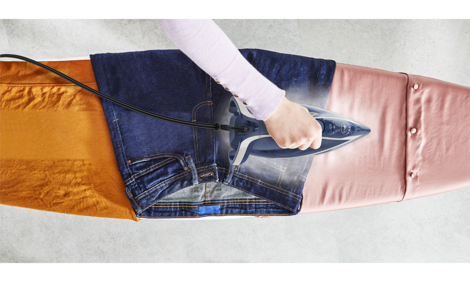 Hơi phun tăng cường lên tới 250 g giúp làm phẳng cả những nếp nhăn cứng đầu: Thâm nhập sâu hơn vào cấu trúc vải để loại bỏ ngay cả những nếp nhăn cứng đầu.