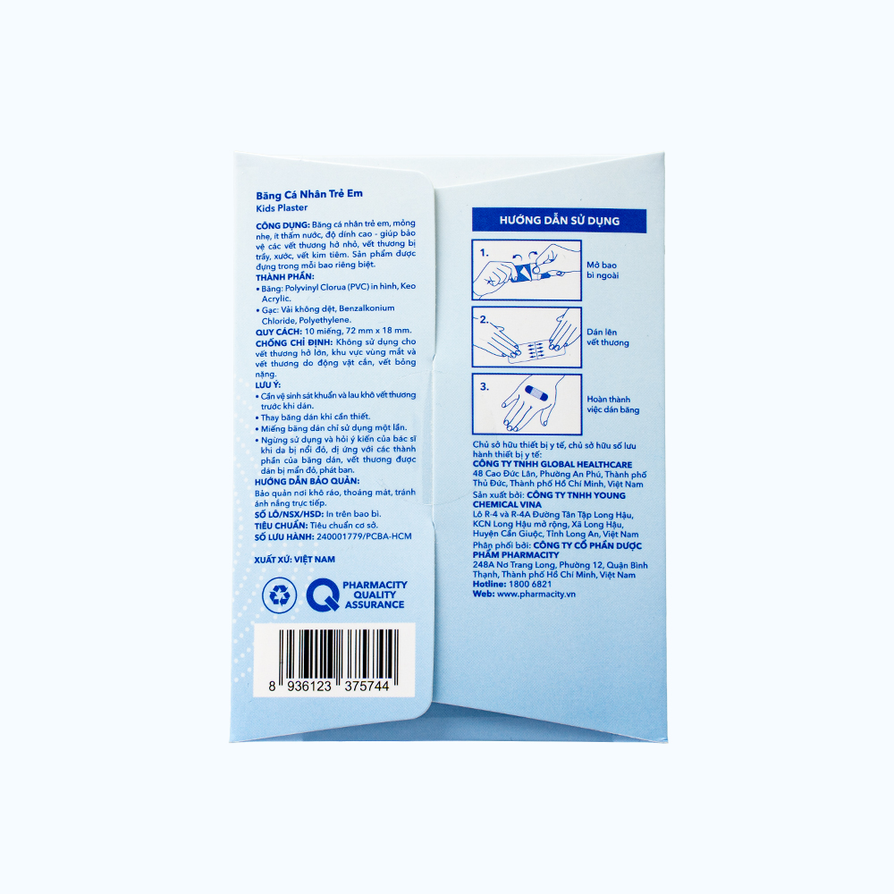 Mua tại TiktokThành phần Băng: Polyvinyl Clorua Gạc: Vải không dệt màu trắng Chỉ định Băng keo thông thoáng, độ dính cao, ít thấm nước, giúp bảo vệ vết thương nhỏ, vết cắt, trầy, xước. Hướng dẫn sử dụng Bước 1: Mở bao bì ngoài Bước 2: Dán lên vết thương Bước 3: Hoàn thành việc dán băng Làm vệ sinh da và lau khô trước khi dán băng. Thay băng hằng ngày. Lưu ý Mọi thông tin trên đây chỉ mang tính chất tham khảo. Đọc kỹ hướng dẫn sử dụng trước khi dùng Thông tin sản xuất Bảo quản: Nơi khô ráo thoáng mát, tránh ánh nắng trực tiếp. Quy cách đóng gói: 10 miếng/hộp
