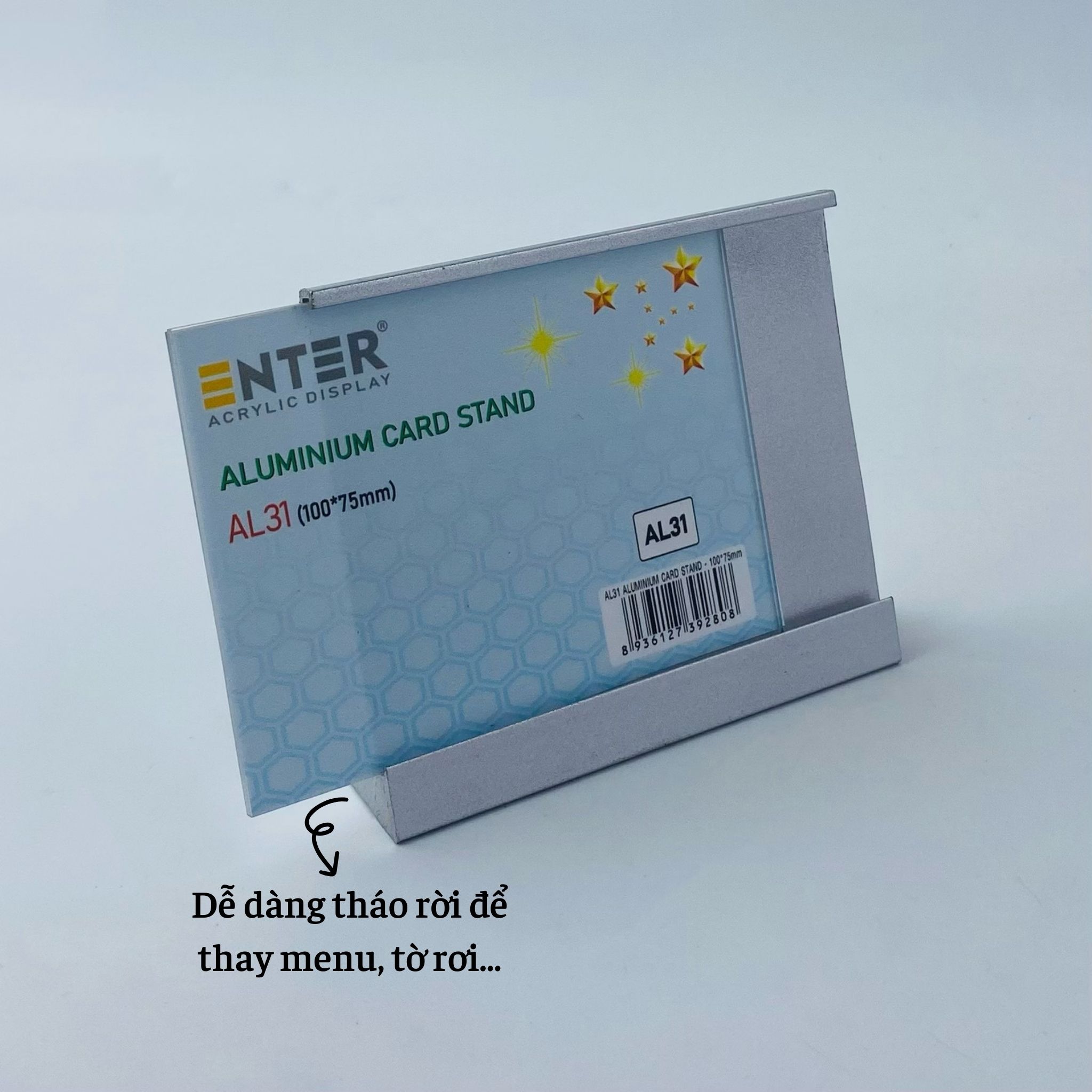 Bảng thông tin để bàn nhôm Enter là sản phẩm làm từ nhôm cao cấp có công dụng hiển thị thông tin sản phẩm tại các nhà hàng, khách sạn... sản phẩm này còn được dùng như một standee để bàn quảng cáo sản phẩm một cách ấn tượng nhất.