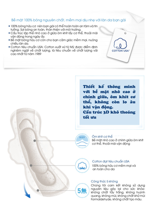 Băng vệ sinh ban ngày cotton: Thành phần và công dụng: BVS có khả năng thấm hút tốt phân giải nhanh chống , đồng thời khử mùi, mang lại cho bạn cảm giác thoáng mát
