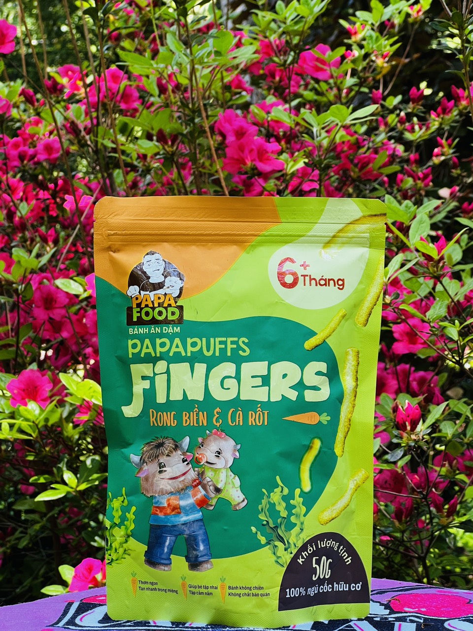 1. Tên sản phẩm: Bánh ăn dặm PAPAPUFFS FINGERS - VỊ RONG BIỂN VÀ CÀ RỐT . 2. Thành phần: Được sản xuất từ 100% Ngũ cốc Hữu Cơ - Gồm gạo lứt hữu cơ,