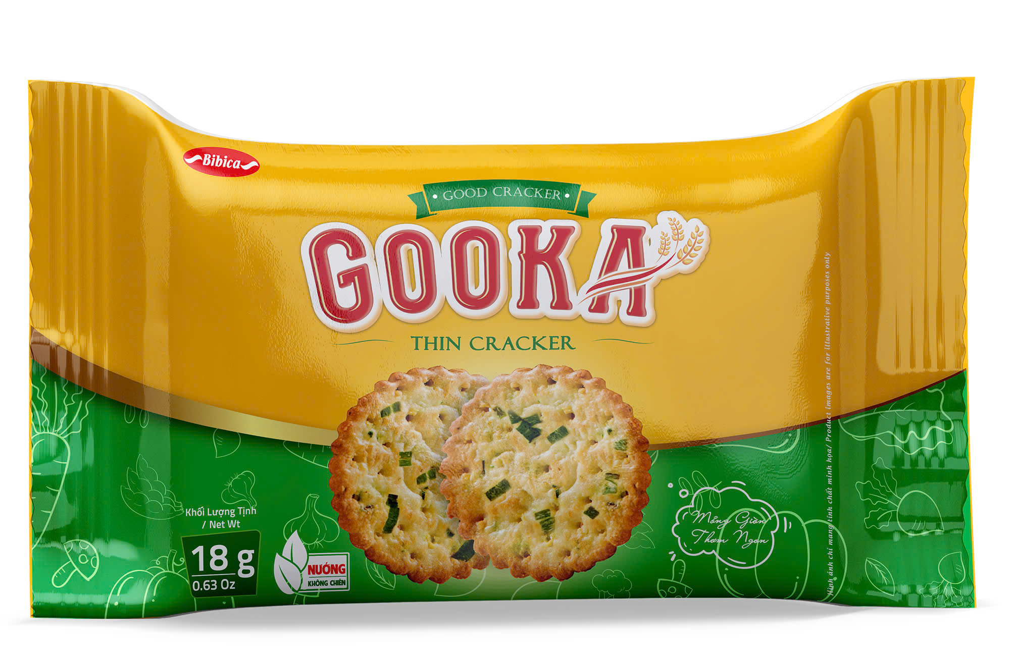 Bánh ngũ cốc cracker Gooka, một sản phẩm mới từ Bibica, với 2 hương vị thơm ngon và giàu dinh dưỡng từ Bắp Dừa - Khoai Tây Phô Mai. Bánh được nướng và không chiên