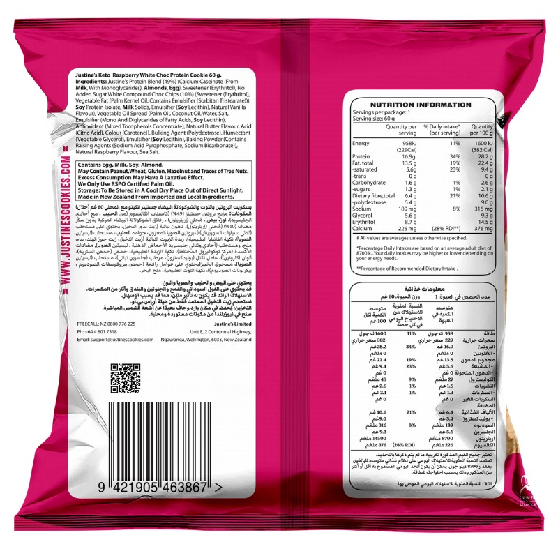 Justine's Protein Blend (49%) (Canxi Caseinate (Từ sữa, Với Monoglyceride), Hạnh nhân, Trứng), Chất tạo ngọt (Erythritol), Không đường, Hợp chất Sô-cô-la Trắng (10%) (Chất tạo ngọt (Erythritol), Chất béo thực vật (Nhân cọ Dầu, Chứa chất nhũ hóa (Sorbitan Tristearate))), Protein đậu nành cô lập, Chất rắn trong sữa, Chất nhũ hóa (Lecithin đậu nành), Hương vani tự nhiên), Dầu thực vật (Dầu cọ, Dầu dừa, Nước, Muối, Chất nhũ hóa (Mono và Diglycerides Of Fatty) Axit, Lecithin đậu nành), Chất chống oxy hóa (Hỗn hợp Tocopherols đậm đặc), Hương bơ tự nhiên, Axit (Axit xitric), Màu (Caroten)), Chất tạo bọt (Polydextrose), Chất giữ ẩm (Glycerol thực vật), Chất nhũ hóa (Lecithin đậu nành), Bột nở ( Chứa các chất nâng cao (Natri Acid Pyrophosphat, Natri Bicarbonat)), Hương vị mâm xôi tự nhiên, Muối biển.
