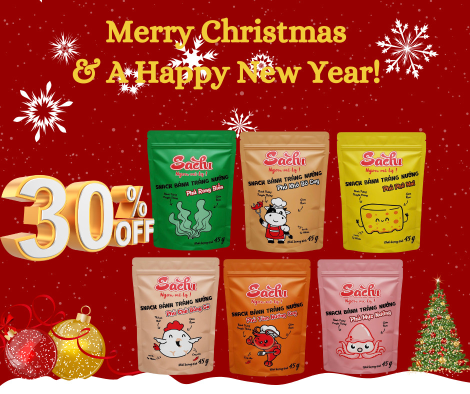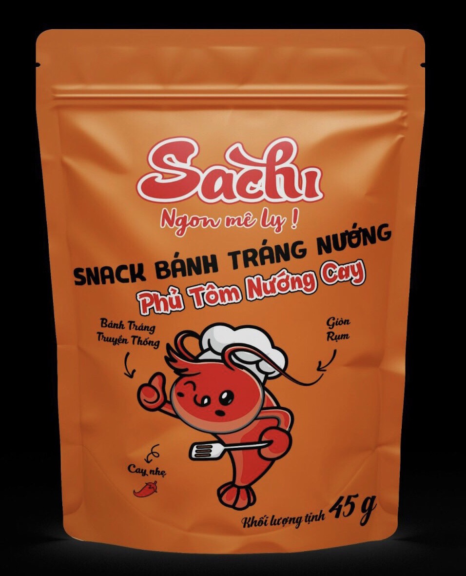 Sản phẩm bánh tráng dừa nướng tẩm khô bò, phô mai, chà bông gà, khô mực, tôm tẩm, rong biển của Sachi với các thành phần chính là bánh tráng dừa, nguyên liệu và nhờ