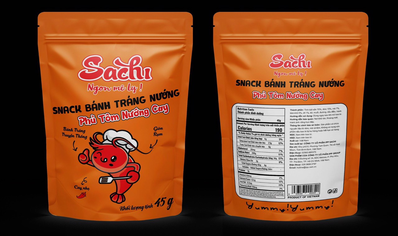 Sản phẩm bánh tráng dừa nướng tẩm tôm tẩm của Sachi với các thành phần chính là bánh tráng dừa, nguyên liệu và nhờ có pha thêm gia vị vào cùng nên bánh có hương