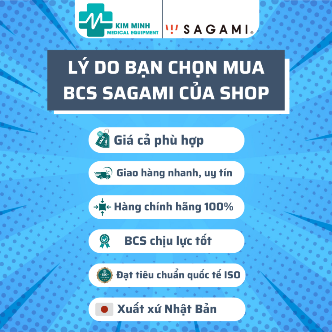 THIẾT BỊ Y TẾ KIM MINH xin kính chào Quý khách Thiết bị Y tế Kim Minh cam kết bán hàng CHÍNH HÃNG. Nói không với hàng giả, kém chất lượng. BCS Sagami do thiết
