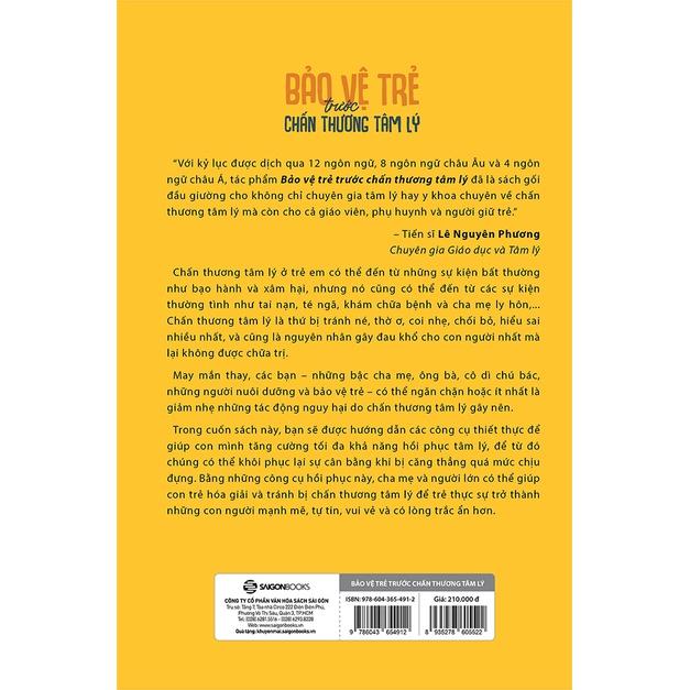“Bảo vệ trẻ trước chấn thương tâm lý” chính là công cụ mà hai tác giả Peter A. Levine và Maggie Kline đã gửi đến cho chúng ta, những người thiết tha quan tâm nhưng chưa biết phải làm cách nào để giúp đỡ thế hệ con em trong một giai đoạn thế giới đầy bất trắc và bất định. Với kỷ lục được dịch qua 12 ngôn ngữ, 8 ngôn ngữ châu Âu và 4 ngôn ngữ châu Á, tác phẩm Trauma-Proofing Your Kid đã là sách gối đầu giường cho không chỉ chuyên gia tâm lý hay y khoa chuyên về chấn thương tâm lý mà còn cho cả giáo viên, phụ huynh và người giữ trẻ.