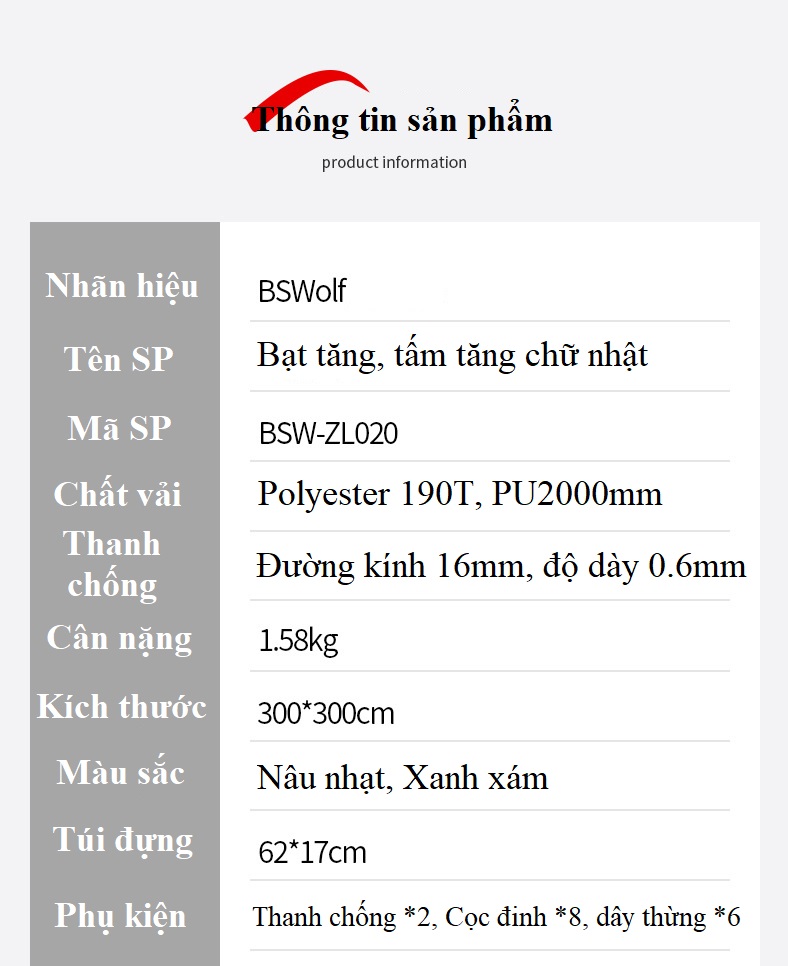 Mua tại TiktokTHÔNG TIN SẢN PHẨM: - Thương hiệu: BSWOLF - Tên sản phẩm: Bạt tăn, tấm tăng chữ nhật - Mã sản phẩm: BSW-ZL020 - Chất vải: Polyester 190T, PU2000mm, UPF 30+ - Thanh chống: Đường
