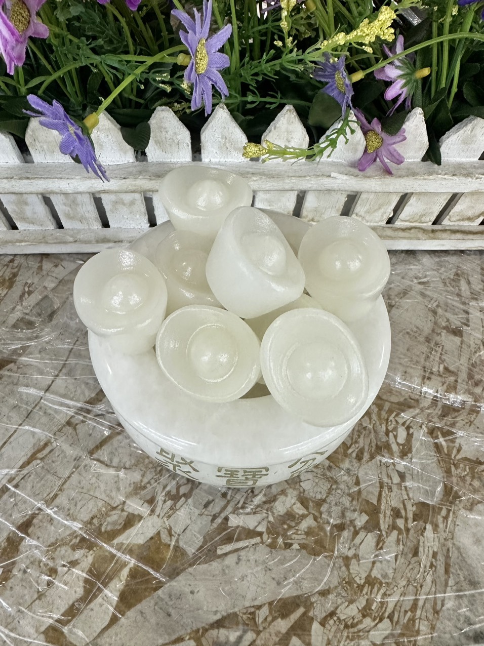 Mua tại TiktokChất liệu: Đá bạch ngọc Kích thước: Đường kính 10 cm Bao gồm: 10 thỏi vàng và 1 đế gỗ Khối lượng: 900g