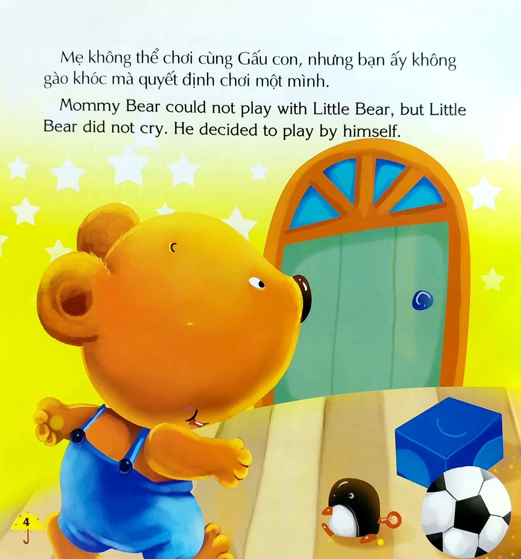 Gấu con rất yêu mẹ. Bạn ấy muốn mẹ chơi cùng mình, nhưng mẹ bạn ấy còn bận nấu cơm nên chưa thể dành thời gian cho bạn ấy ngay được. Thế là bạn ấy đã nghĩ ra một cách để có thể tự chơi một mình mà không làm phiền đến mẹ đấy. Bạn ấy còn chơi rất vui nữa kìa. Bé có đoán được Gấu con đã chơi trò gì không nào? Bé hãy mở cuốn sách này ra để theo dõi câu chuyện của Gấu con và cùng Gấu con học cách yêu thương mẹ của mình nhé