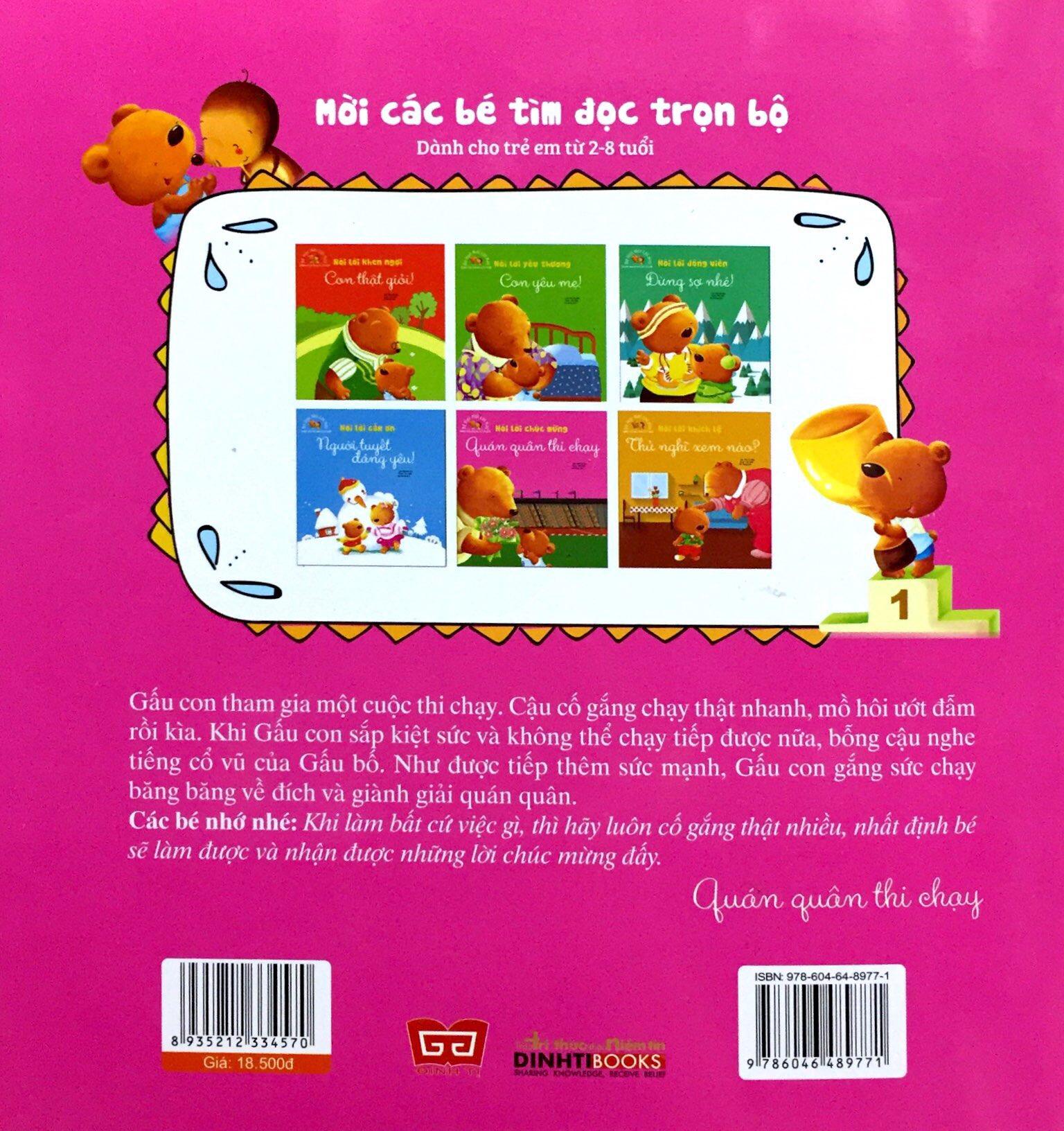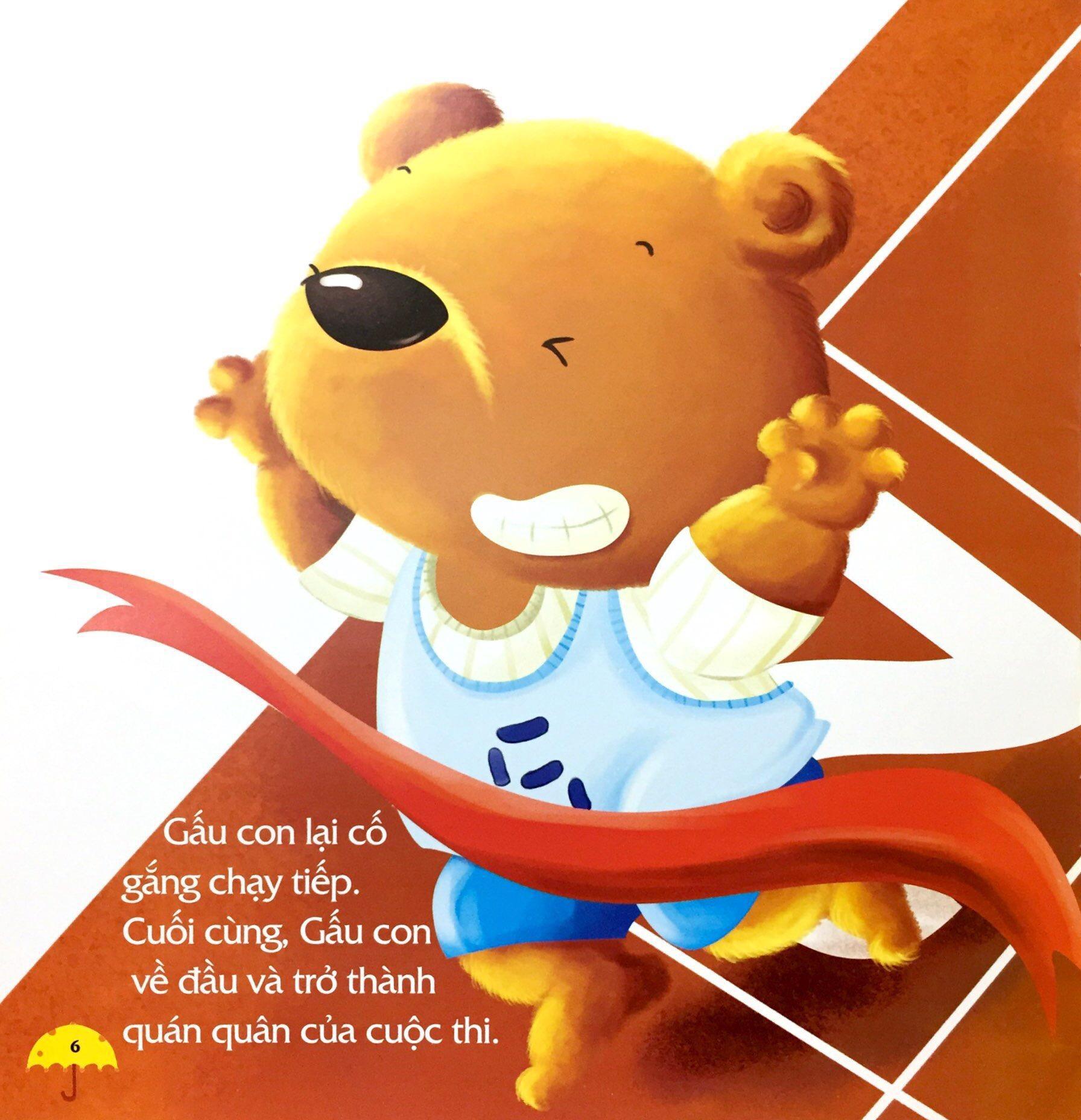 Gấu con tham gia một cuộc thi chạy. Cậu cố gắng chạy thật nhanh, mồ hôi ướt đẫm rồi kìa. Khi Gấu con sắp kiệt sức và không thể chạy tiếp được nữa, bỗng cậu nghe tiếng cổ vũ của Gấu bố. Như được tiếp thêm sức mạnh, Gấu con gắng sức chạy băng băng về đích và giành giải quán quân.