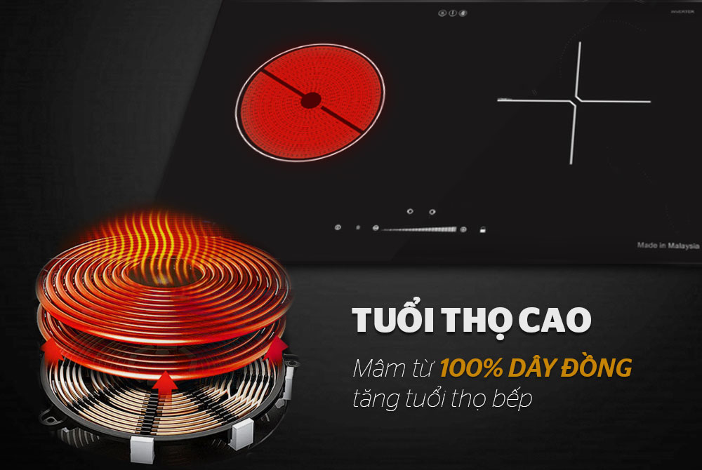 - Bếp từ hỗn hợp ( 1 từ + 1 hồng ngoại) - Bàn phím điều khiển cảm ứng dạng chạm - Công nghệ Inverter biến tần, tiết kiệm 35% điện năng - Chức năng hẹn giờ