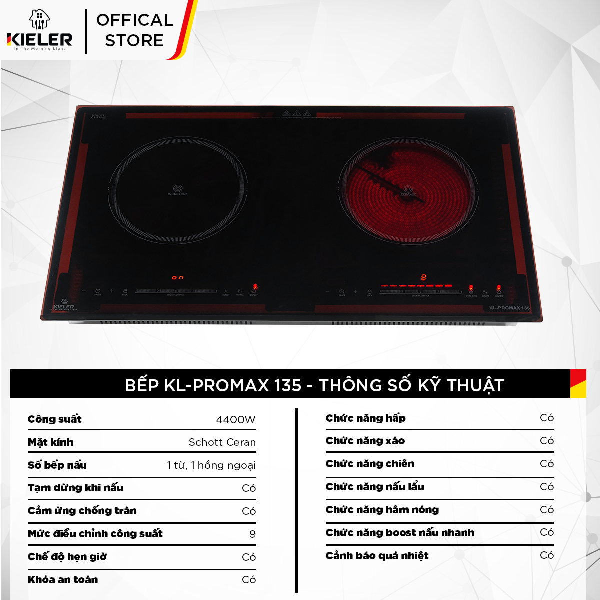 - Tên sản phẩm: Bếp đôi điện từ hồng ngoại Kieler KL-PROMAX 135 mặt kính Schott Ceran, Bếp đôi có chế độ cảm ứng chống tràn 4400W