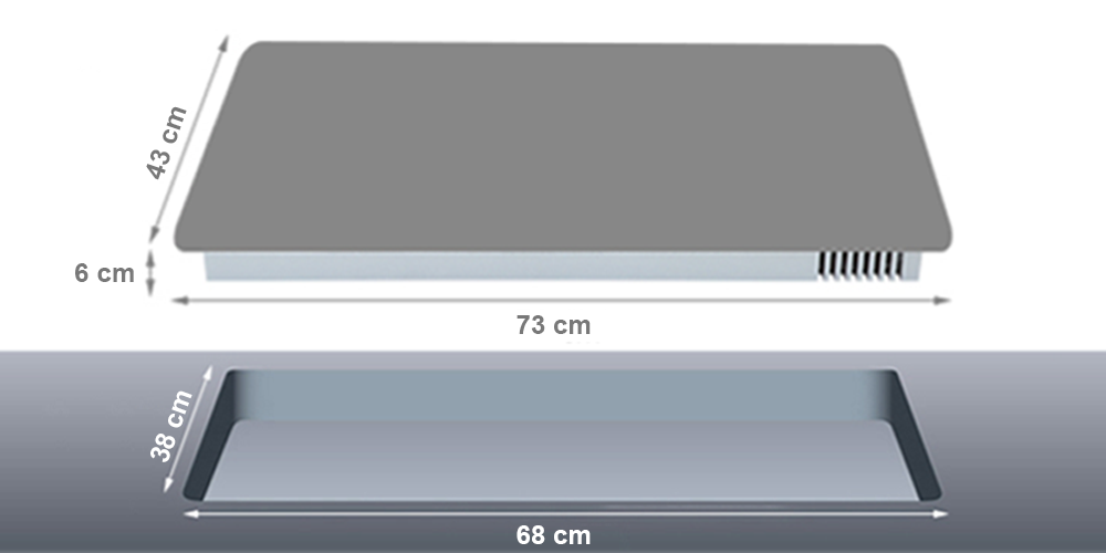 KT mặt kính: 730x430mm KT khoét đá: 680x380mm