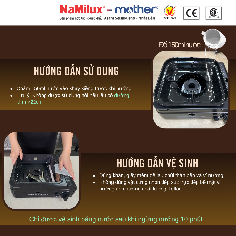 TIỆN ÍCH NHÂN ĐÔI – SÁNH ĐÔI LẨU NƯỚNG ⮚  Sản phẩm được tích hợp 2 chức năng nướng và nấu trên cùng 1 bếp. Chỉ cần 10 giây chuyển từ nướng sang nấu và ngược lại   CHỐNG GIÓ SIÊU VIỆT ⮚ Đầu đốt được thiết kế nằm hoàn toàn bên trong thân bếp:  Sử dụng được nơi có gió lùa, ngoài trời Đun sôi 1.5 lít nước trong vòng 10 phút   NƯỚNG KHÔNG KHÓI ⮚ Bếp có chức năng điều chỉnh nhiệt độ nướng – nấu. Chế độ nướng khống chế được nhiệt độ giúp thực phẩm nướng không bị cháy khét, ít khói ⮚ Thiết kế mặt vỉ nướng có các rãnh thoát mỡ giúp thức ăn ngon hơn và tốt cho sức khoẻ   TIẾT KIỆM 50% GAS ⮚ Sử dụng công nghệ đầu đốt trong, tối ưu hiệu quả đốt và tận dụng toàn bộ nhiệt lượng toả ra trong quá trình nấu   Tiết kiệm 50% gas tiêu thụ (1 lon gas có thể sử dụng liên tục 3 giờ)   AN TOÀN ⮚ Vỉ được đúc nguyên khối ADC12, mặt vỉ nướng được phủ lớp chống dính Teflon Whitford - USA, đạt chứng nhận an toàn thực phẩm của tổ chức FDA (Mỹ) ⮚ Sử dụng van ngắt gas an toàn 2 cấp theo tiêu chuẩn an toàn quốc tế. Miếng chắn nhiệt 2 lớp giúp bảo vệ lon gas không bị nóng khi sử dụng bếp trong thời gian dài   HƯỚNG DẪN SỬ DỤNG ⮚ Châm 150ml nước vào khay kiềng trước khi nướng ⮚ Lưu ý: Không được sử dụng nồi nấu lẩu có đường kính >22cm.    HƯỚNG DẪN VỆ SINH ⮚ Dùng khăn, giấy mềm để lau chùi thân bếp và vỉ nướng ⮚ Không dùng vật cứng nhọn tiếp xúc trực tiếp bề mặt vỉ nướng ảnh hưởng chất lượng Teflon ⮚ Chỉ được vệ sinh bằng nước sau khi ngừng nướng 10 phút   THÔNG SỐ KỸ THUẬT ⮚ Công suất: 1.65 kW (1,420 kcal/h) ⮚ Lượng gas tiêu thu: 120g/h ⮚ Sử dụng gas: Lon gas NaMilux mới ⮚ Khối lượng bếp + vỉ: 2.3kg ⮚ Kích thước bếp: C134 D306 R284 (mm) ⮚ Xuất xứ: Việt Nam  ⮚ Bảo Hành: 6 tháng Hàng chính hãng được phân phối độc quyền bởi Công Ty NAMILUX, chính sách 1 đổi 1 trong vòng 14 ngày nếu sản phẩm thuộc lỗi nhà sản xuất.
