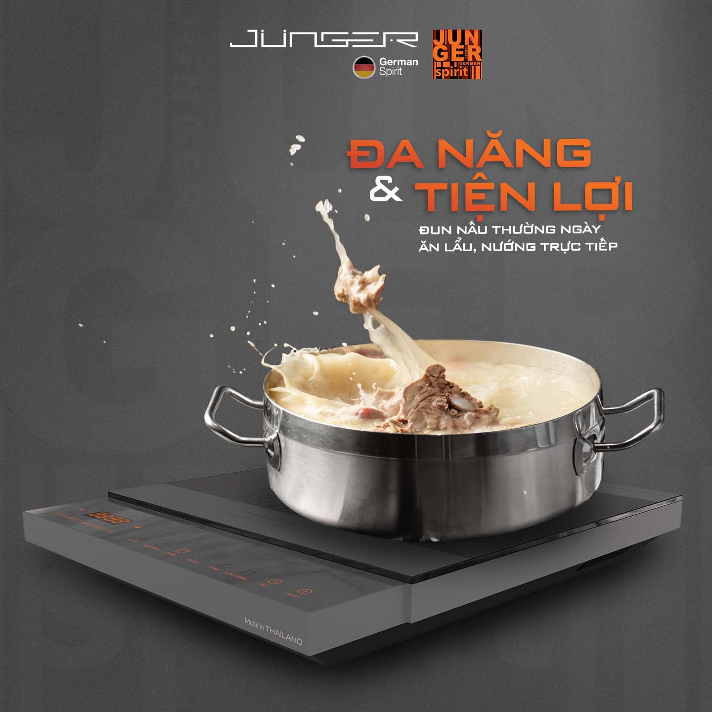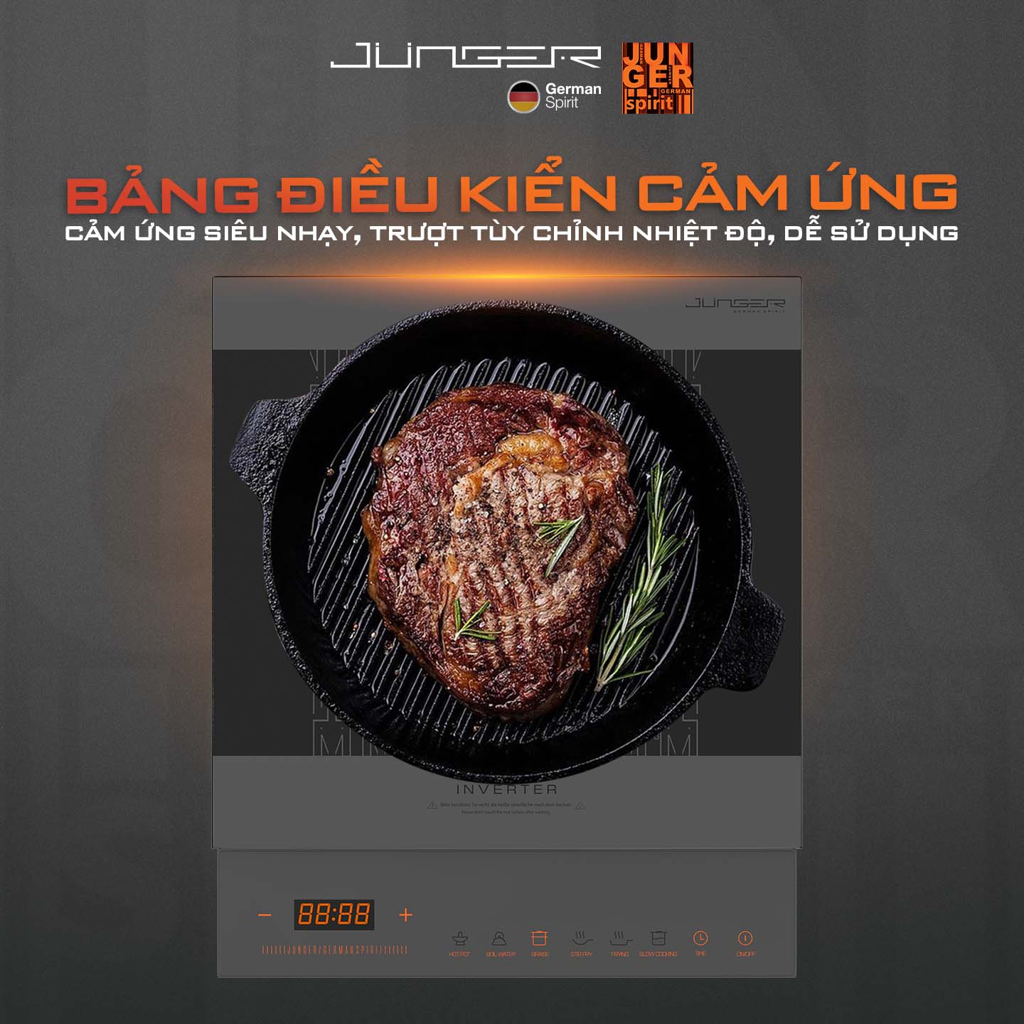 Bằng việc nghiên cứu nhu cầu nấu nướng trong gia đình, Junger mang đến dòng bếp đơn với 9 mức công suất trải dài từ 120W đến 2000W. Thiết kế bảng điều khiển cảm ứng Direct Control kết hợp Slider trượt nhanh, nhạy dễ dàng thao tác và lựa chọn chức năng, nhiệt độ và mức công suất phù hợp với từng món ăn.