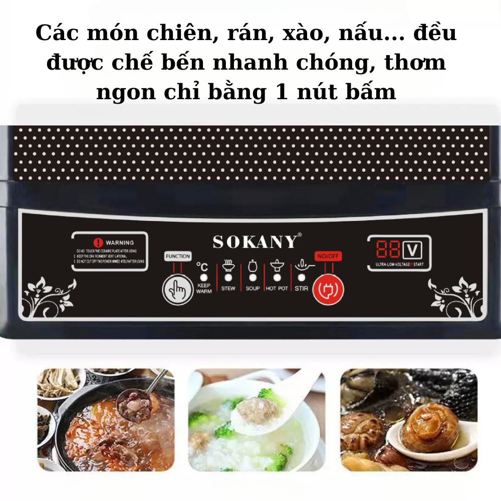 - Chi tiết: - Điều khiển điện tử - Chức năng chiên, xào, nấu, nướng - Sử dụng được cho tất cả các loại nồi - Bản điều khiển điện tử có 5 chức năng