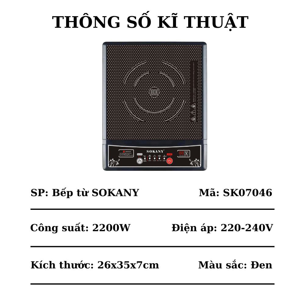 - Loại bếp: Bếp từ đơn - Công suất vùng nấu: 2000W - Điện áp: 220V/50 Hz - Kích thước vùng nấu: Hãng không công bố - Kiểu lắp đặt: Lắp dương - Bảng điều