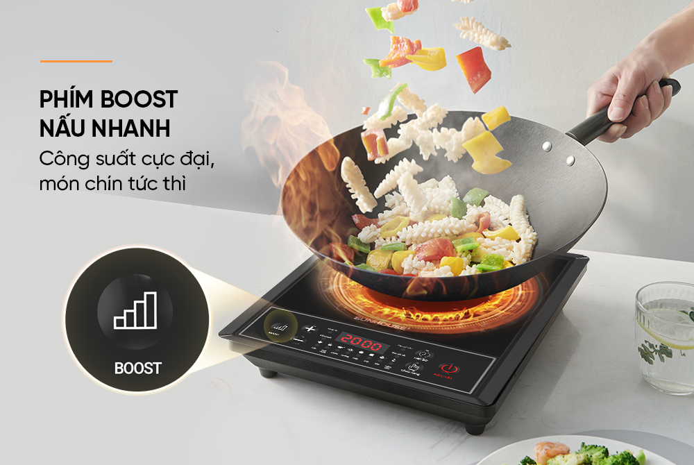 Khi cần nấu ăn nhanh mà vẫn đảm bảo độ chín đều và giữ trọn hương vị món ăn, phím Boost trên bếp từ chính là trợ thủ đắc lực. Chức năng này giúp tăng công suất lên mức tối đa trong thời gian ngắn, lý tưởng để đun sôi nước, nấu canh hay hâm nóng thực phẩm siêu tốc. Bạn sẽ tiết kiệm được kha khá thời gian, đặc biệt là trong những lúc bận rộn mà vẫn đảm bảo bữa ăn ngon, nóng hổi cho cả nhà.