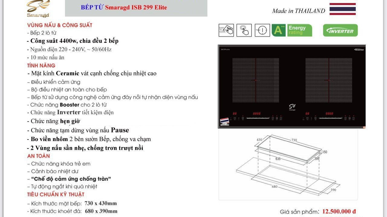 Mua tại TiktokBếp từ đôi Smaragd ISB-299 Elite công nghệ Inverter, Booster chuẩn Đức xuất xứ Thái Lan Tên sản phẩm: Bếp từ đôi ISB-299 Elite - Nhập khẩu Thái Lan Thương hiệu: Smaragd Đức Xuất xứ: Thái Lan Điện áp: 220-240V / 50-60 Hz Công suất tổng: 4400W ( chia đều 2 vùng nấu ) Vùng nấu: 02 vung đều từ Kích thước mặt: 730 x 430 mm | Kích thước âm: 680 x 390 mm Trọng lượng: bếp 8.05kg, đóng hộp 9.45kg Kích thước hộp: 83 x 50 x 13cm Chất liệu: Mặt kính Ceramic (gốm thủy tinh), bo viền nhôm 2 bên, 2 vùng nấu sần nhẹ chống trơn trượt khi nấu Chức năng: 10 mức nấu ăn, khóa trẻ em, Booster cho 2 lò từ, Inverter tiết kiệm điện, hẹn giờ, tạm dừng vùng nấu Pause Điều khiển: cảm ứng trượt Slider Control Bảo hành 24 tháng chính hãng