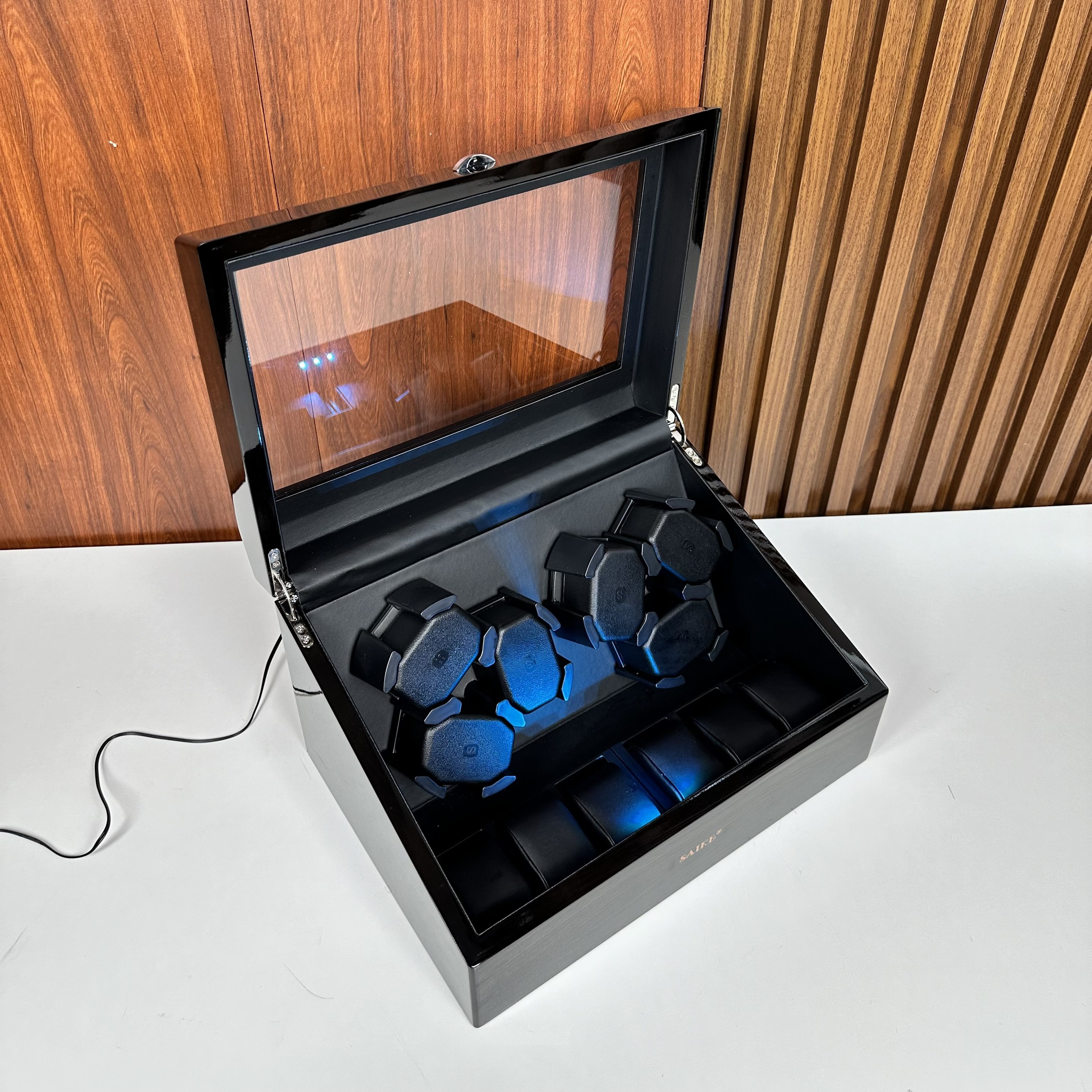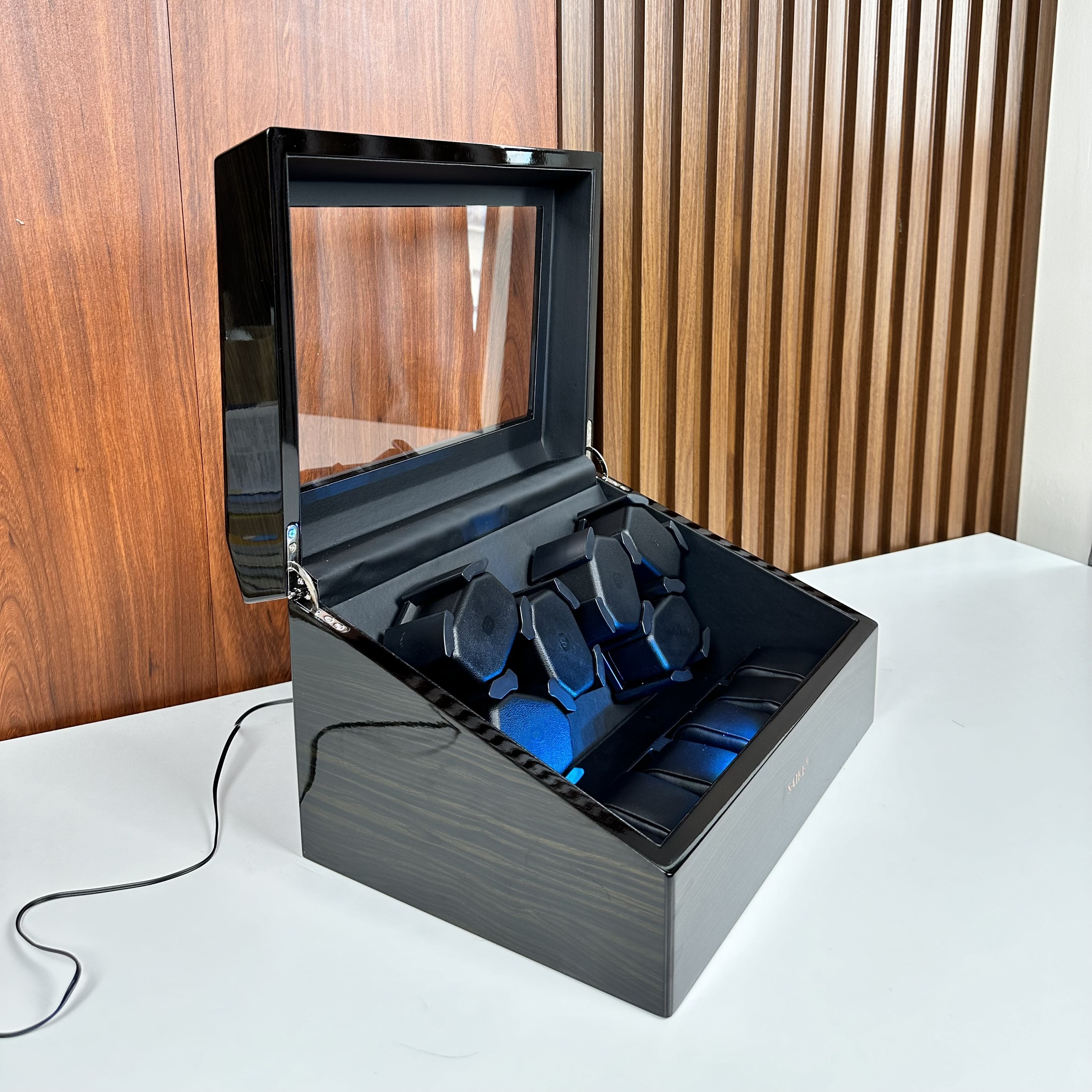 Hộp Đồng Hồ Cơ 6 Xoay + 6 Tĩnh Vỏ Gỗ Sơn Vân Gỗ Mun Có Đèn Led