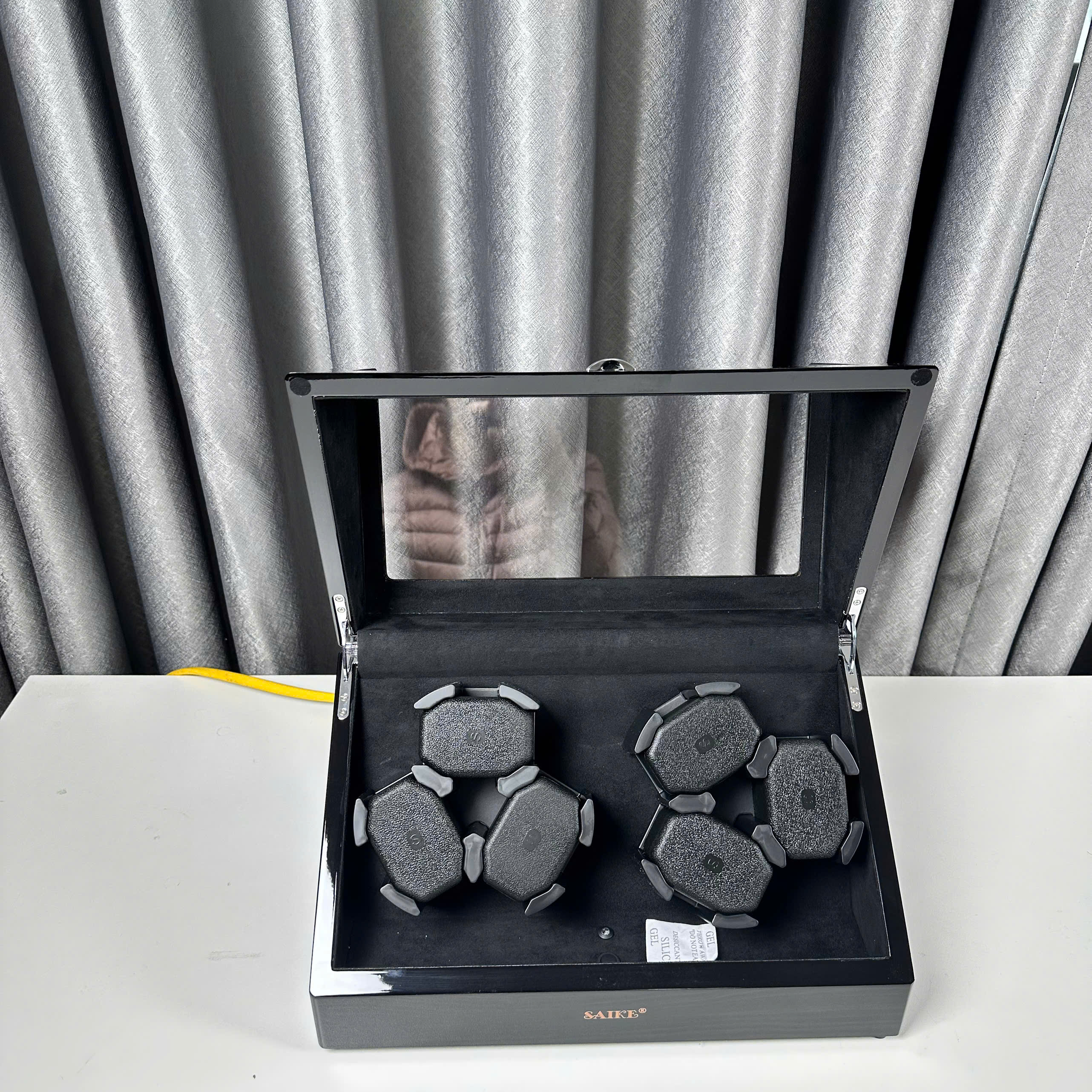 Mua tại TiktokHộp xoay 6 đồng hồ Saike vỏ gỗ nền nỉ đen ✿ Chất liệu: Thân gỗ MDF sơn bóng vân gỗ đàn hương, Trong nền nỉ đen, gối bằng mút cao su cao cấp đàn hồi tốt