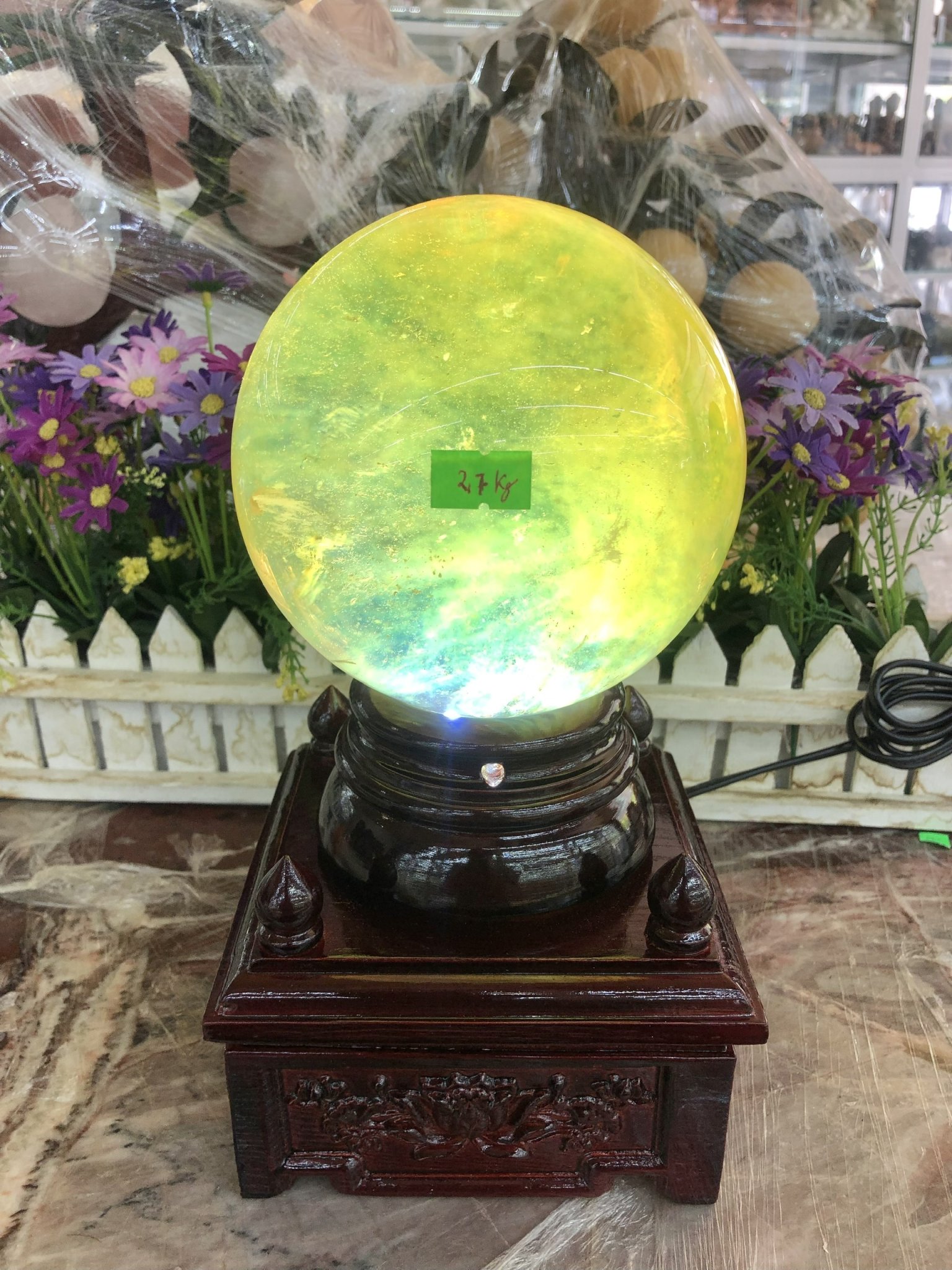 Quả Cầu Phong Thủy Đá Canxit Vàng Tự Nhiên Đế Xoay Đèn Led 6,3kg-16,8cm