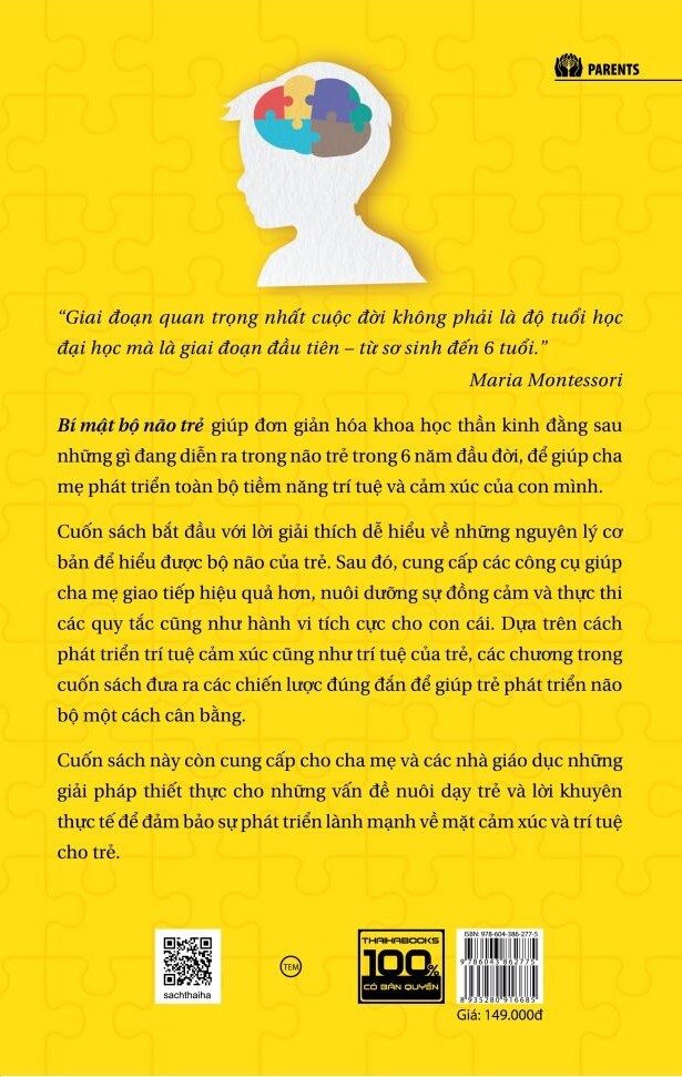 Sự thật là chúng ta biết rất nhiều điều về bộ não và những điều đó có thể giúp ích cho cha mẹ, nhưng đáng tiếc là họ lại không hề hay biết. Tác giả muốn giúp bạn hiểu cách thức bạn có thể tác động tích cực đến sự phát triển bộ não của con. Hàng trăm nghiên cứu chỉ ra rằng bộ não có khả năng linh hoạt rất lớn và những bậc cha mẹ áp dụng các chiến lược đúng đắn có thể giúp con mình phát triển não bộ một cách cân bằng. Đây là lý do tại sao tôi tập hợp các nguyên lý cơ bản, công cụ và kỹ thuật giúp bạn trở thành người có ảnh hưởng nhất tới sự phát triển trí tuệ và cảm xúc của con. Với những nguyên lý, công cụ và kỹ thuật này, bạn sẽ không chỉ giúp trẻ phát triển tốt các kỹ năng trí tuệ và cảm xúc mà còn góp phần ngăn ngừa những khó khăn trong quá trình phát triển của trẻ, chẳng hạn như thiếu tập trung, trầm cảm hoặc các vấn đề về hành vi. Khẳng định rằng kiến thức cơ bản về cách bộ não của trẻ phát triển và tự vận hành sẽ giúp ích rất nhiều cho những bậc cha mẹ muốn tận dụng chúng. Tin rằng những kiến thức, chiến lược và kinh nghiệm mà bạn tìm thấy dưới đây sẽ góp phần biến công việc làm cha mẹ của bạn thành một trải nghiệm vô cùng thỏa mãn.