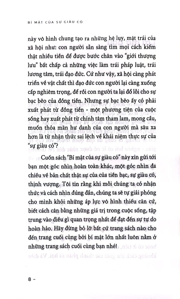 Cuốn sách “Bí mật của sự giàu có” sẽ gửi tới bạn một góc nhìn hoàn toàn khác, một góc nhìn đa chiều về bản chất thật sự của của tiền bạc, sự giàu có, thịnh vượng.