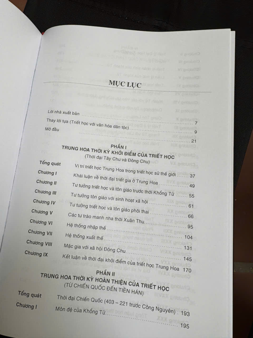 • Triết học Trung Hoa: từ thời kỳ khởi điểm đến thời kỳ hoàn thiện, bao gồm các học phái lớn như Khổng giáo, Đạo giáo, Pháp gia, cùng các biến chuyển tư tưởng trong thời kỳ cận đại.