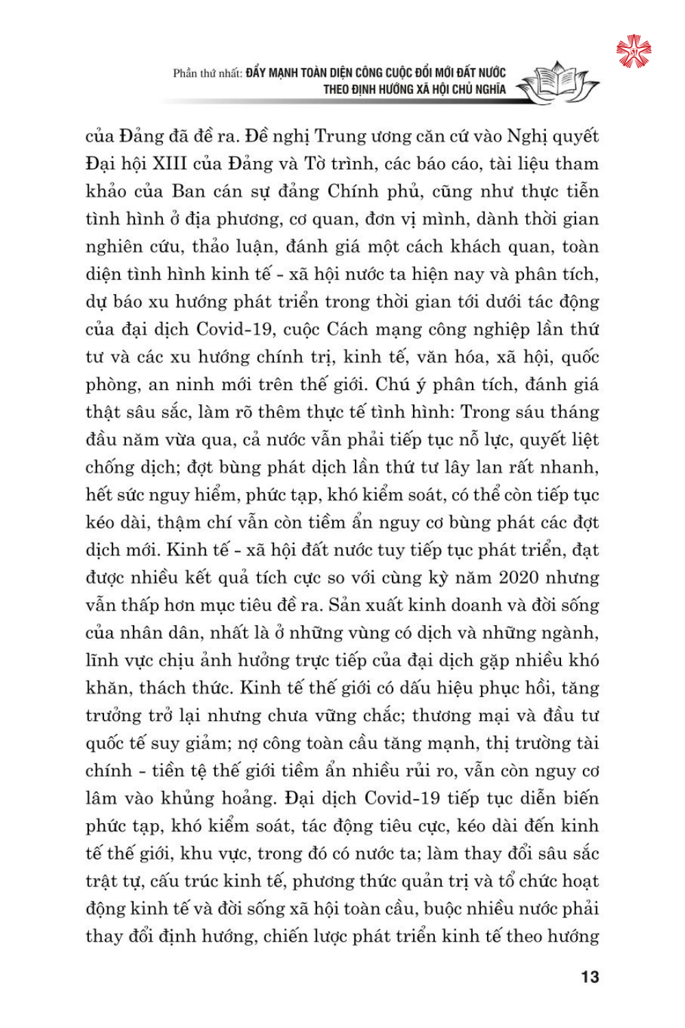 Trong bối cảnh đại dịch COVID-19 diễn biến phức tạp, tác động đến toàn thế giới, trong nước cũng ảnh hưởng rất nặng nề, song sự định hướng mang tầm chiến lược của Trung ương Đảng, đứng đầu là đồng chí Tổng Bí thư là động lực quan trọng để toàn Đảng, toàn dân ta vượt qua khó khăn, thử thách, nhanh chóng cụ thể hoá, triển khai Nghị quyết và những mục tiêu của Đại hội XIII với quyết tâm cao nhằm tạo ra bước đột phá, biến thách thức thành cơ hội, tận dụng mọi thời cơ, tranh thủ mọi điều kiện, hoàn thành các kế hoạch đề ra với kết quả cao nhất.