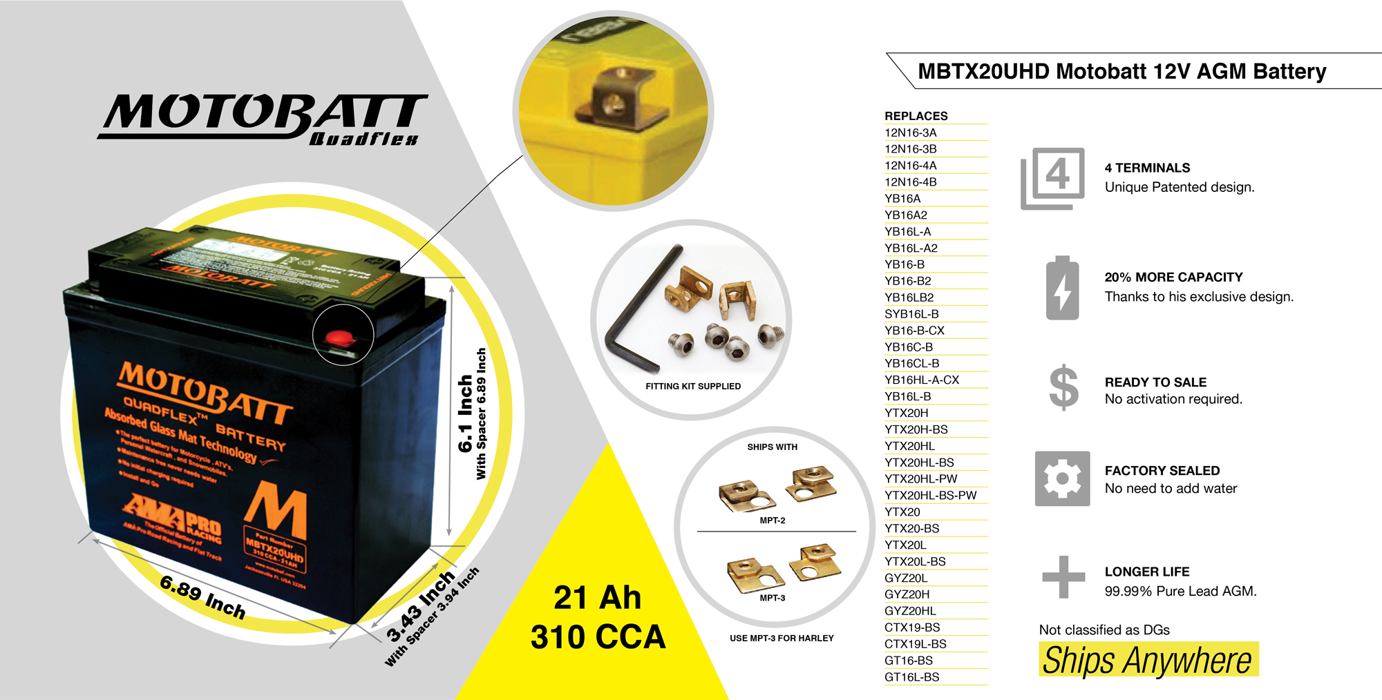 Bình Ắc Quy MotoBatt Quadflex MBTX9U - 12V - 10.5Ah - CCA160 -Kích Thước; 151x87x105 mm - Trọng lượng: 3.4kg - Bảo Hành 6 tháng Phù hợp cho xe máy phân khối lớn của các