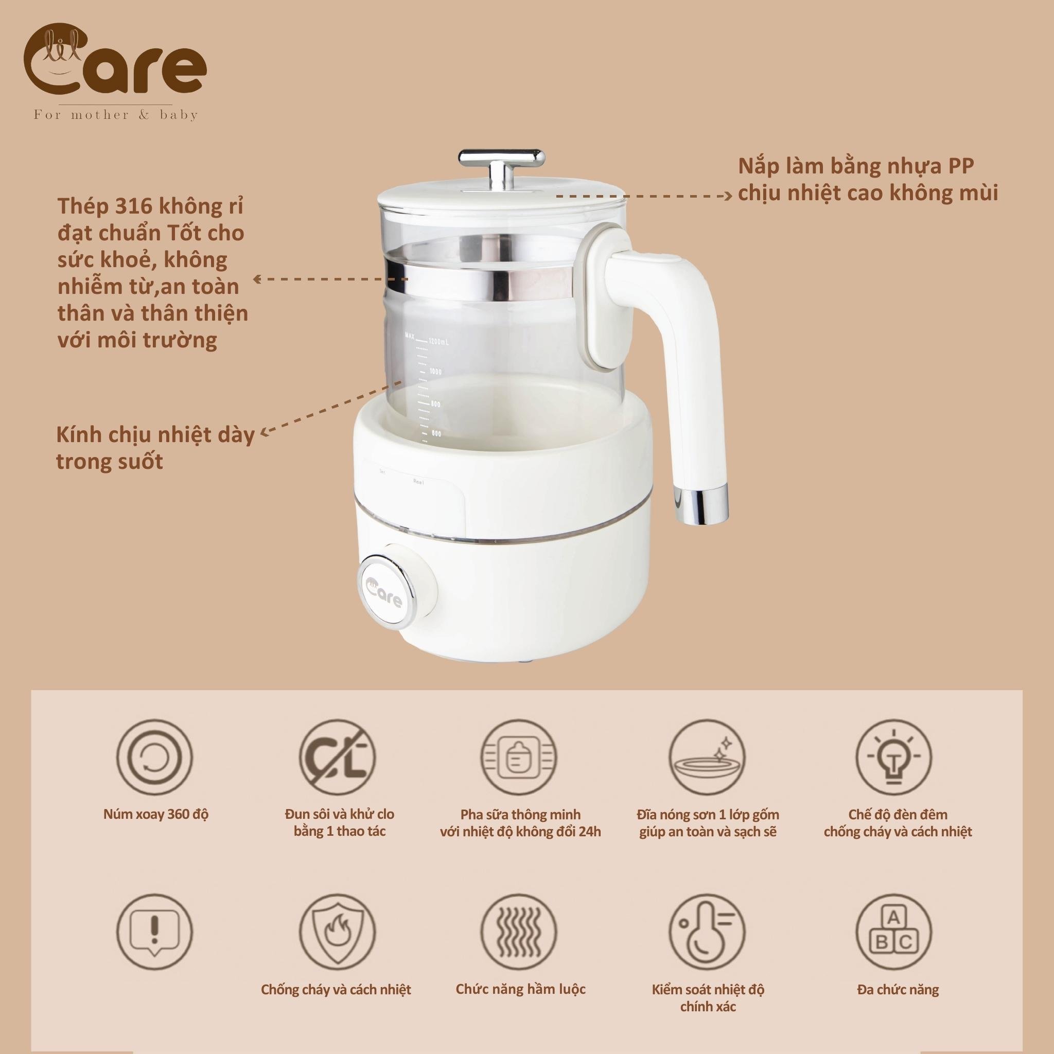 2. Ưu điểm nổi bật Đun sôi nước chỉ trong 5 phút Tùy chỉnh nhiệt độ giữ ấm nước. Kiểm soát nhiệt độ chính xác từ 30-99*C Đa chức năng tiện lợi: hầm, luộc, tiệt trùng Chế độ đèn phát sáng vào ban đêm Khả năng khử Clo tồn dư chỉ sau 5 phút Thiết kế hiện đại, tiện lợi Thời gian giữ ấm ở nhiệt độ dưới 70 độ C lên tới 48 giờ liên tục, đảm bảo mẹ luôn có nước để pha sữa cho bé Chức năng bộ nhớ Bình sẽ động ghi nhớ thói quen của mẹ khi sử dụng, nếu mẹ thường xuyên pha sữa thì bình sẽ ghi nhớ nhiệt độ pha sữa mà mẹ thường sử dụng, và nếu mẹ thường xuyên pha trà, bình cũng sẽ tự động chuyển sang chế độ pha trà mà mẹ không cần thực hiện thêm một thao tác nào sau khi nước sôi