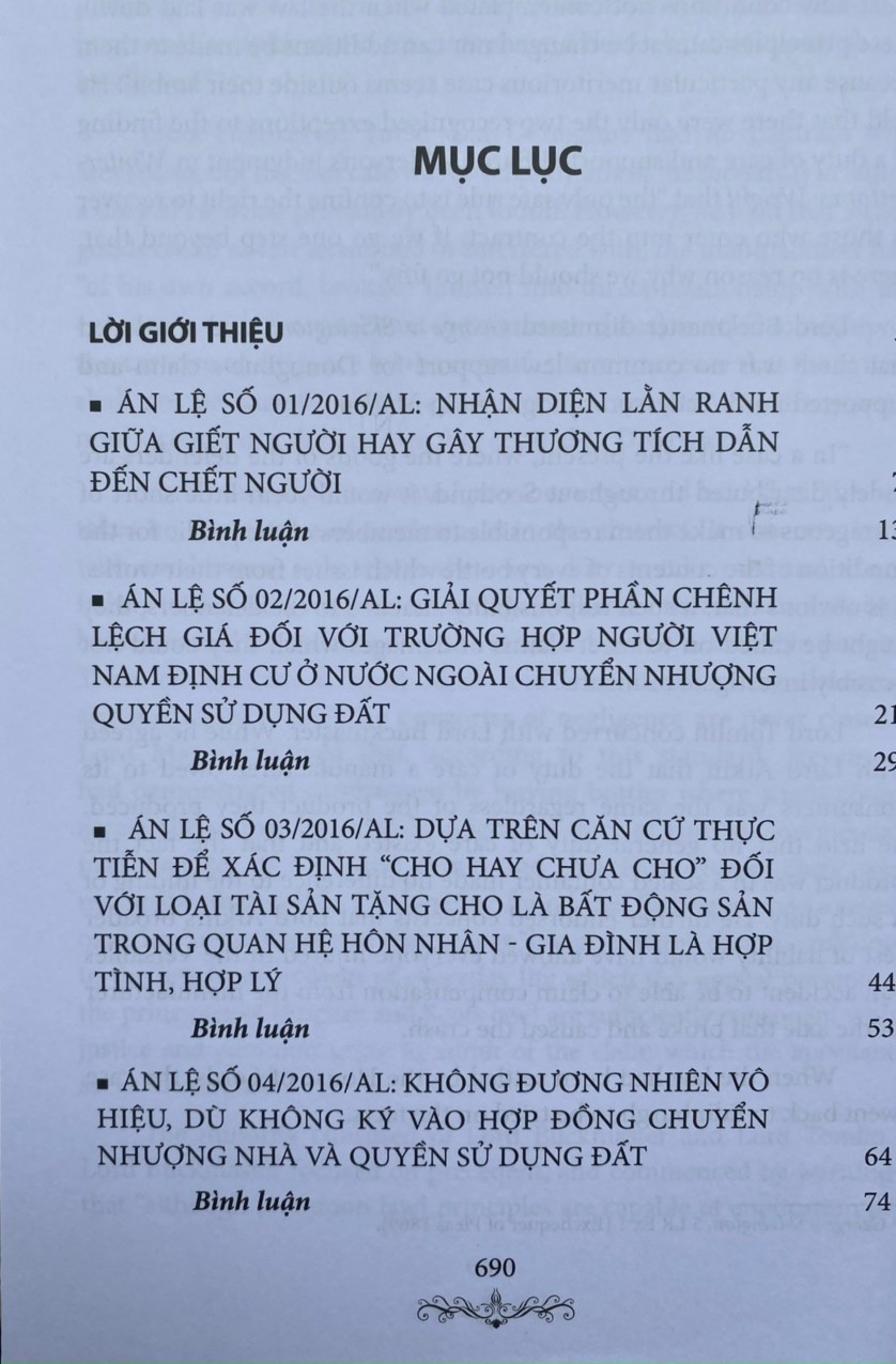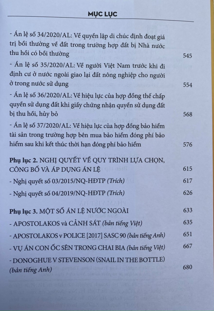 Hy vọng cuốn sách sẽ đáp ứng được phần nào nhu cầu của đông đảo bạn đọc, trước hết là các cán bộ trong các cơ quan tư pháp, các luật sư, các nhà nghiên cứu, các giảng viên, sinh viên luậ trong việc tìm hiểu, nghiên cứu, tham khảo, ứng dụng các án lệ đã được công bố; đồng thời, giúp người dân có thêm vốn kiến thức pháp luật về các tình huống tranh chấp được chọn là án lệ, có thể tự bảo vệ quyền và lợi ích hợp pháp của mình một cách tốt nhất .
