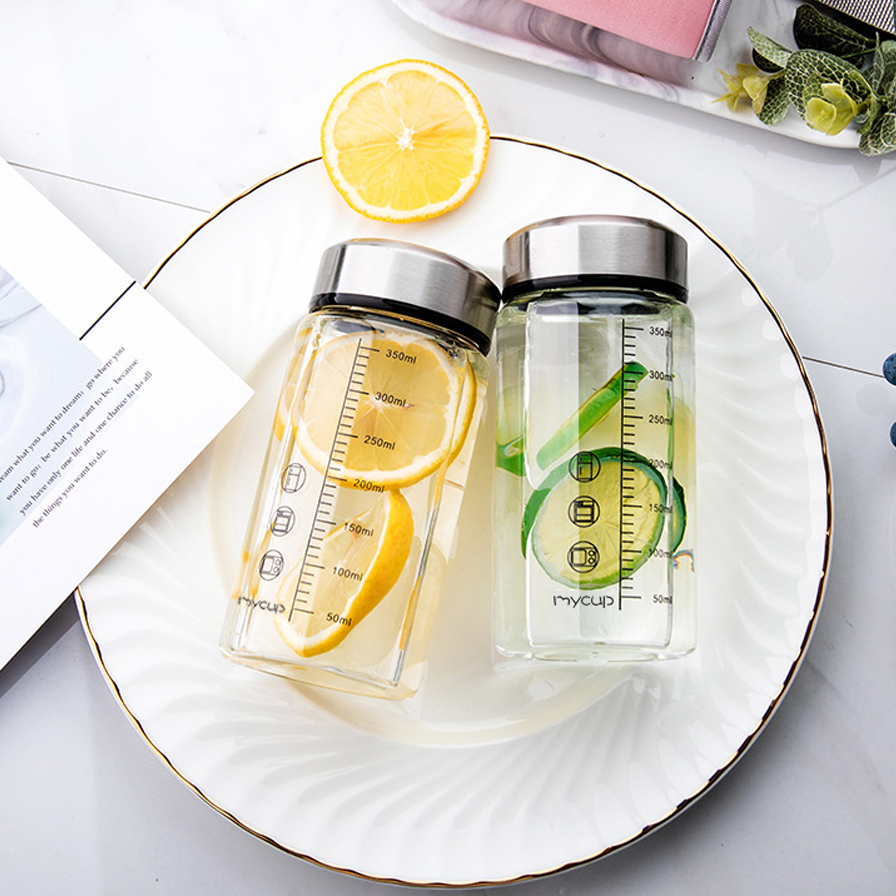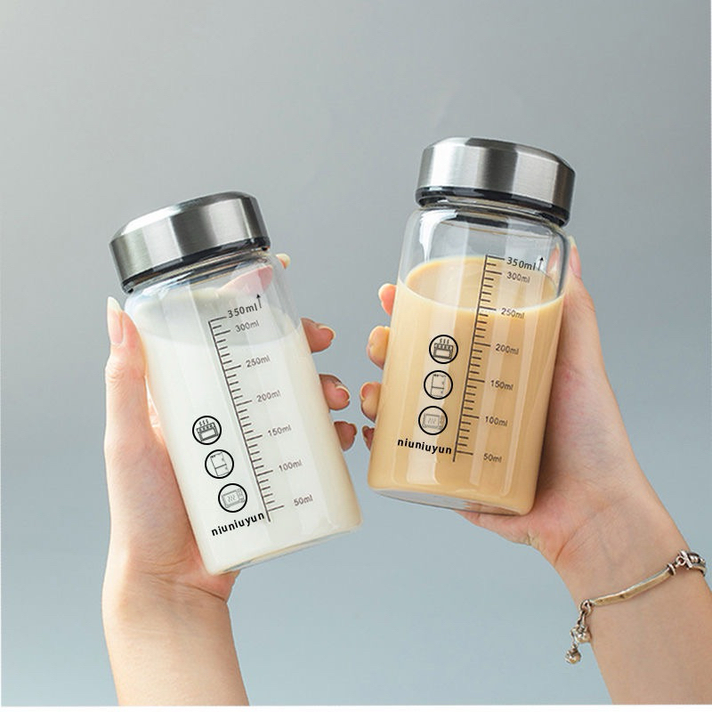 ✨Bình Nước Sữa Thủy Tinh 350ml Nắp Inox Di Động Ăn Sáng Cà Phê Nước Ép Trà Sữa Chia Vạch Tặng Kèm Túi Giao Màu Ngẫu Nhiên