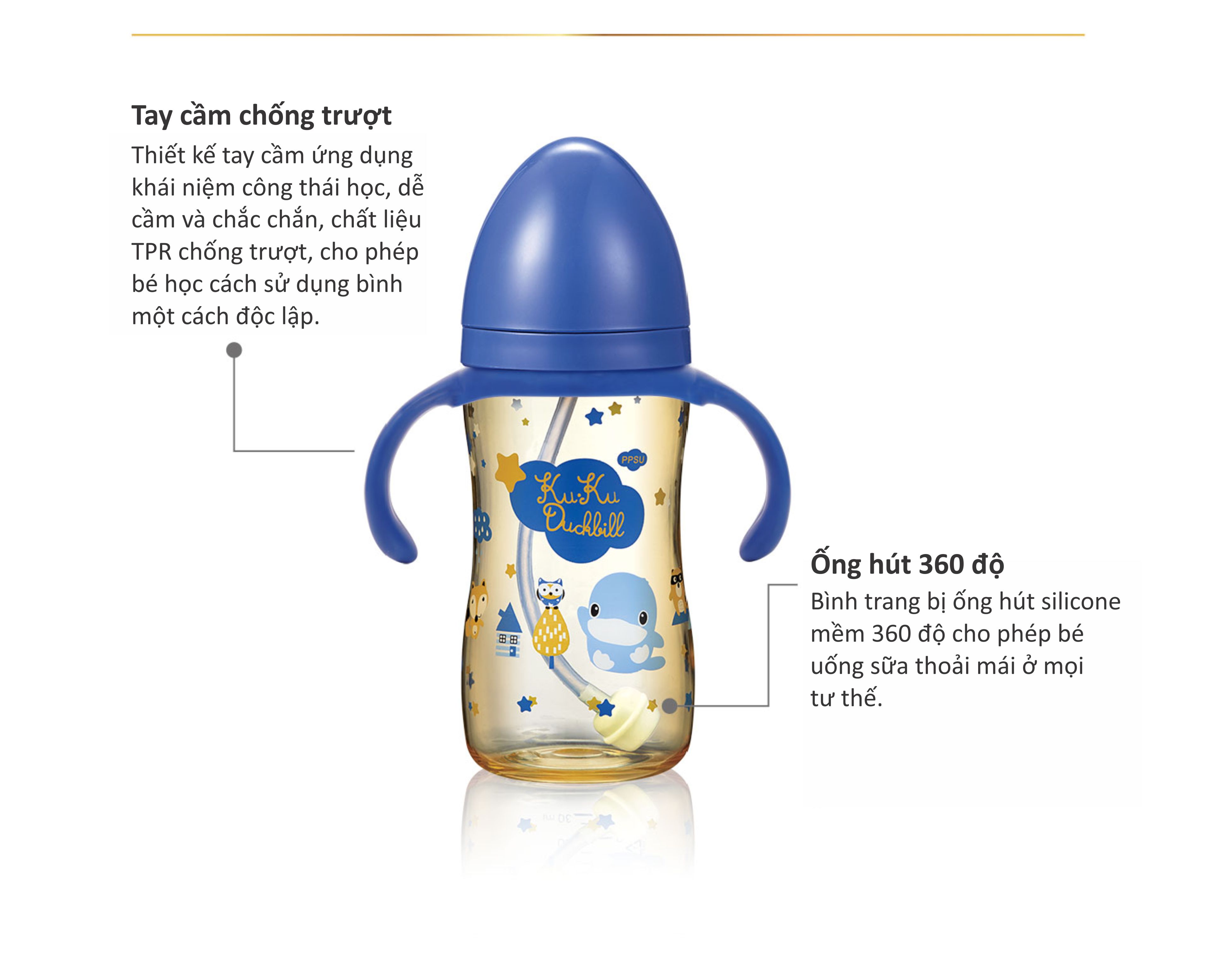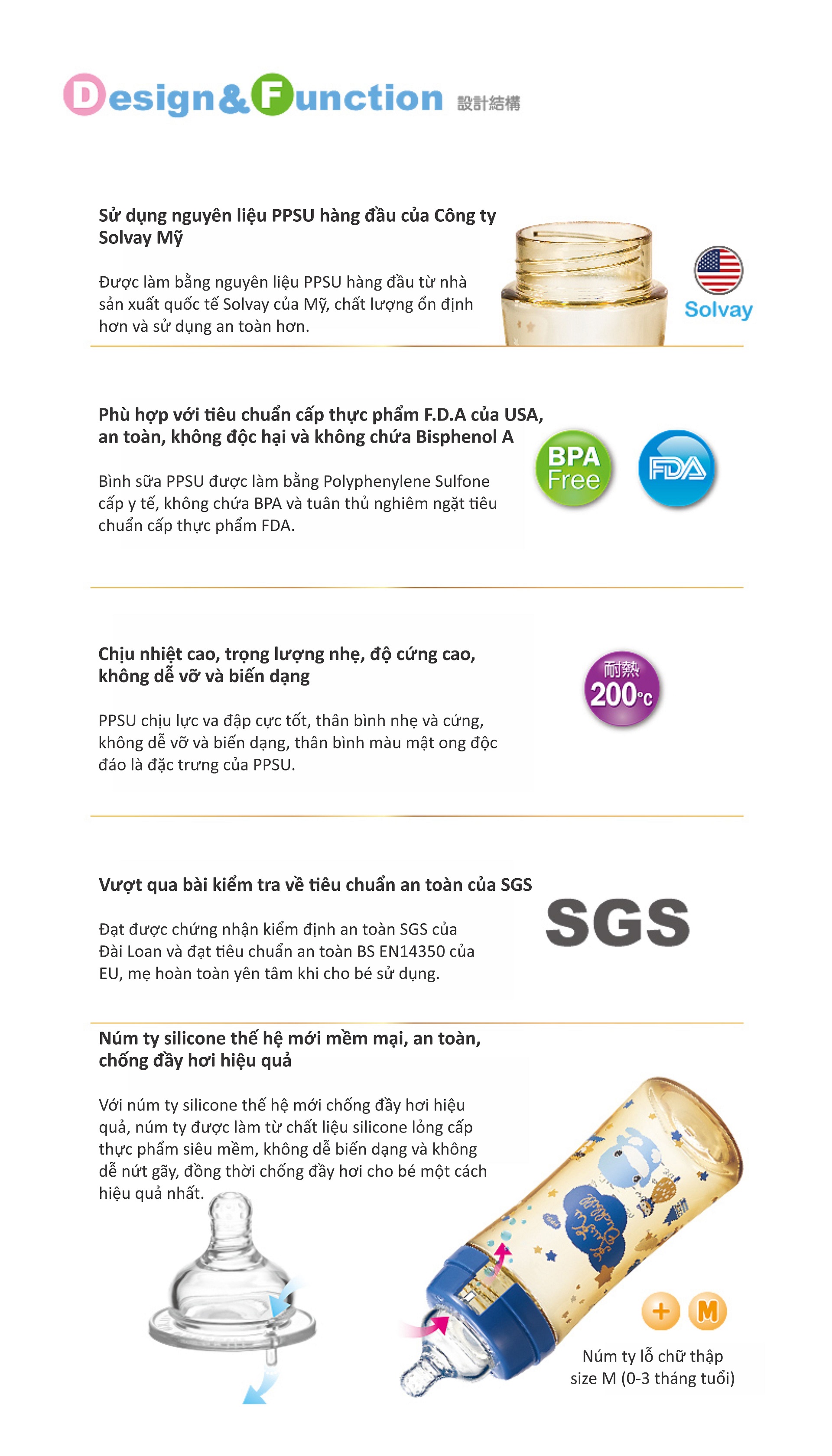 Được làm bằng nguyên liệu PPSU hàng đầu từ nhà sản xuất quốc tế Solvay của Mỹ, chất lượng ổn định hơn và sử dụng an toàn hơn.