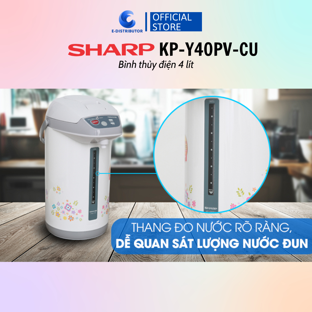 Bình Thủy Điện SHARP KP-Y40PV-CU dung tích 4 lít dùng tốt cho gia đình, văn phòng… đun nước nhanh sôi với công suất 700 W..Ruột bình bằng thép không gỉ phủ chống dính Poly-Flon chất lượng cao, đun nước an toàn, dễ vệ sinh giúp tránh đóng cặn.