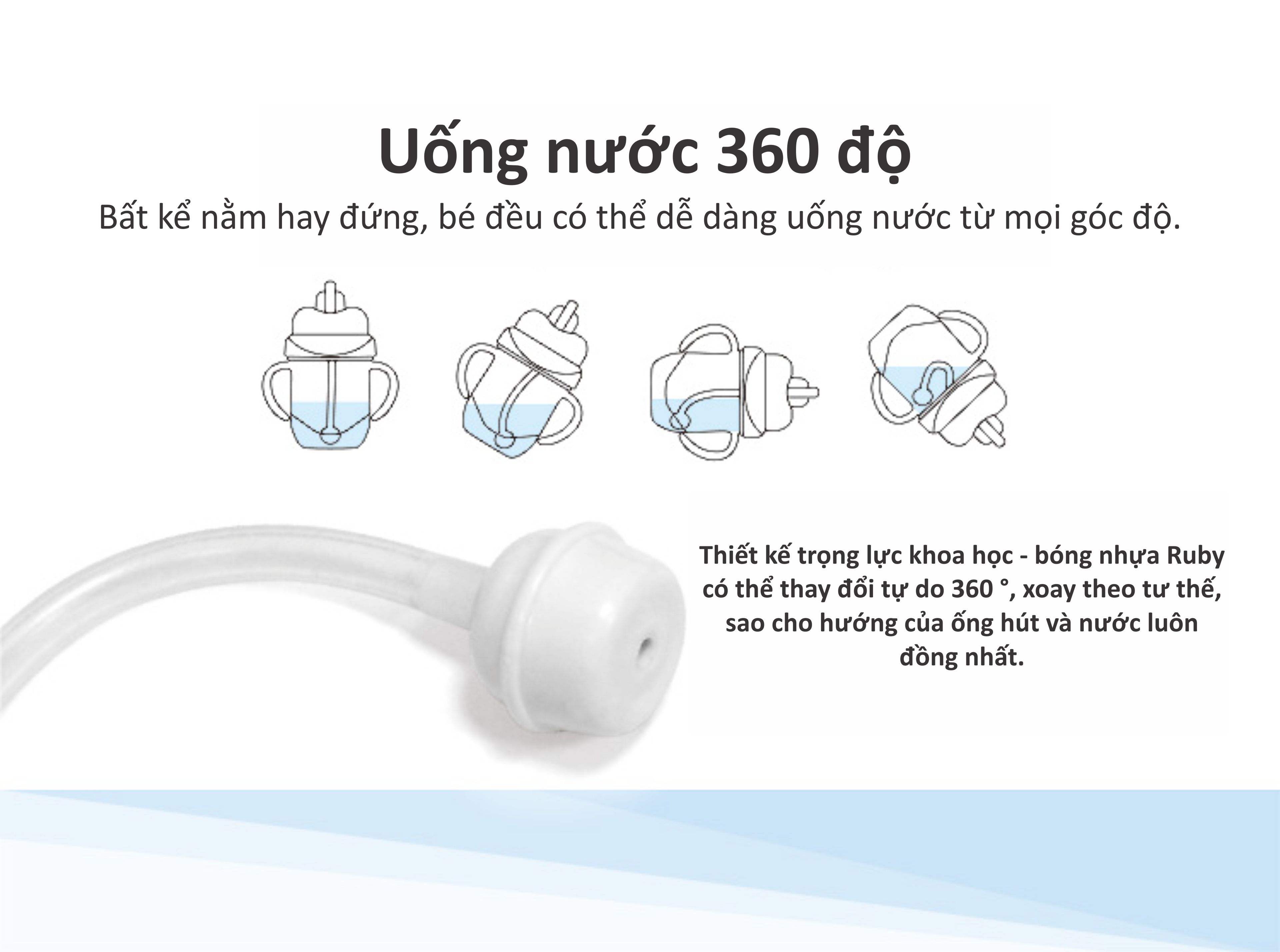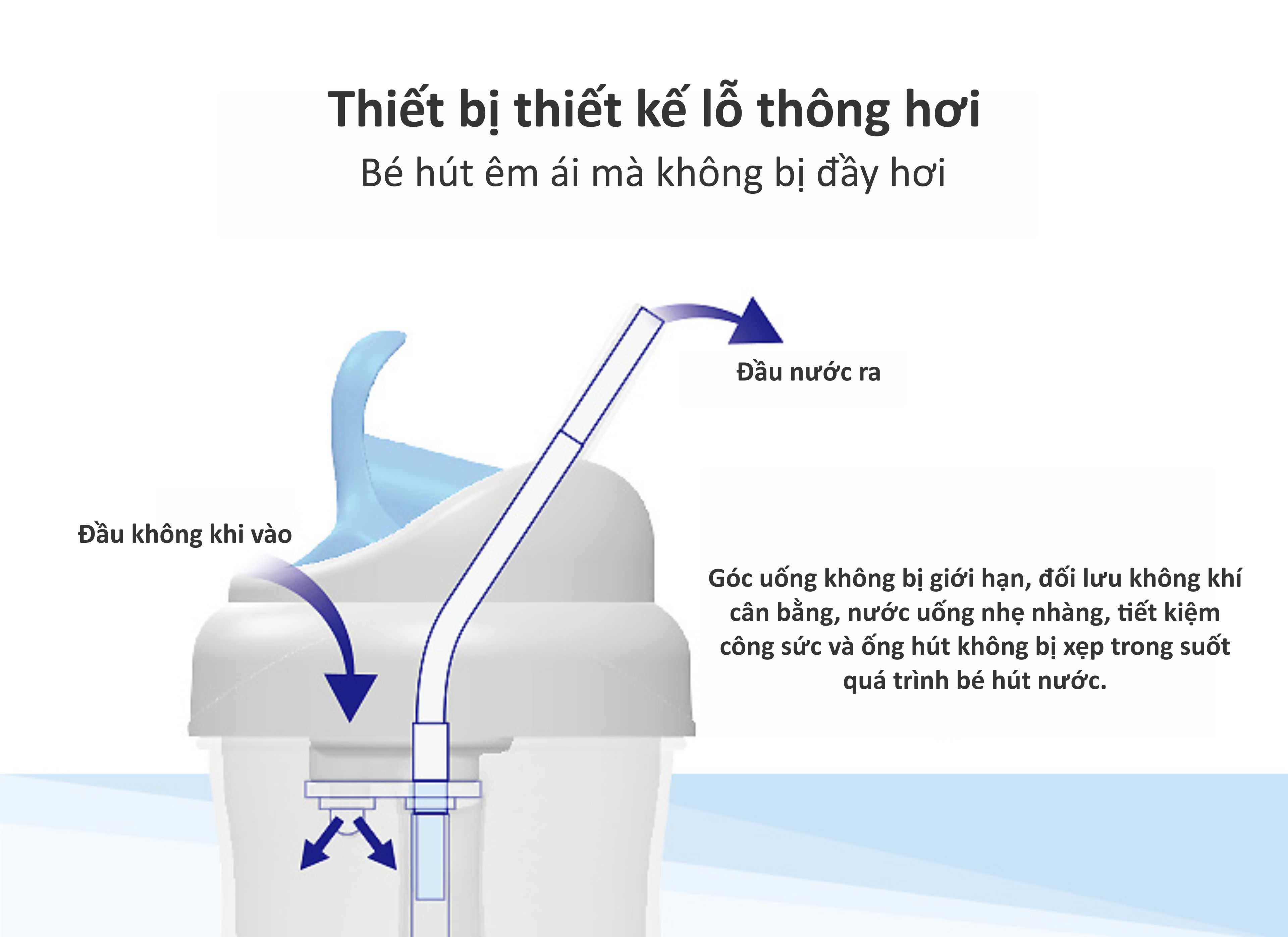 Góc uống không bị giới hạn, đối lưu không khí cân bằng, nước uống nhẹ nhàng, tiết kiệm công sức và ống hút không bị xẹp trong suốt quá trình bé hút nước.