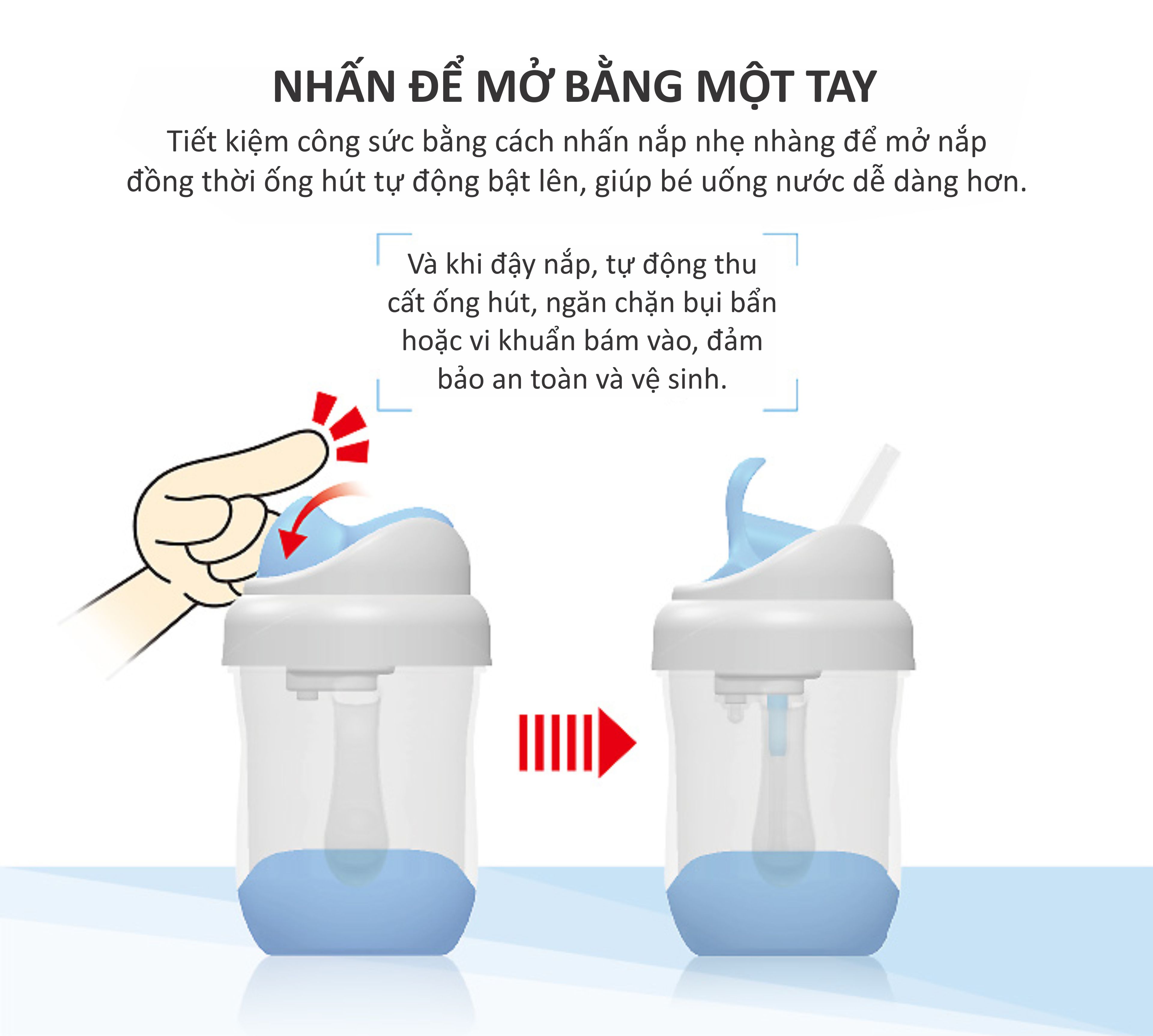 Tiết kiệm công sức bằng cách nhấn nắp nhẹ nhàng để mở nắp đồng thời tự động bật ống hút lên, giúp bé uống nước dễ dàng hơn.