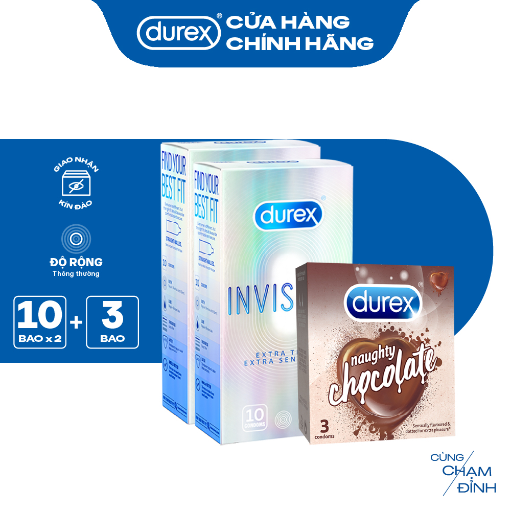 Mua tại TiktokBộ 2 hộp bao cao su Durex Invisible siêu mỏng (52mm, 10 bao/hộp) + 1 Durex Naughty Chocolate hương choco (52mm, 3 bao/hộp)