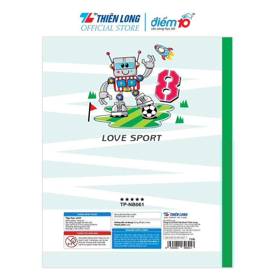 Tập học sinh Điểm 10 TP-NB-061 (96 trang - 4 ô ly vuông) là một sản phẩm mới thuộc nhóm sản phẩm tập học sinh, mang nhãn hiệu Điểm 10. Sản phẩm được sản xuất theo công nghệ hiện đại, màu sắc đẹp, sắc nét.