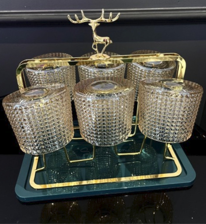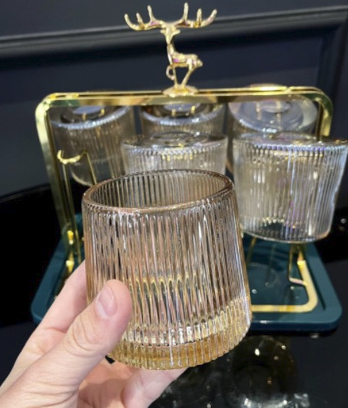 ✨Bộ 6 cốc thủy tinh vàng đế lồi cao cấp dùng uống nước hoặc rượu tây kèm giá úp hình đầu hươu ( giao hoa văn ngẫu nhiên )