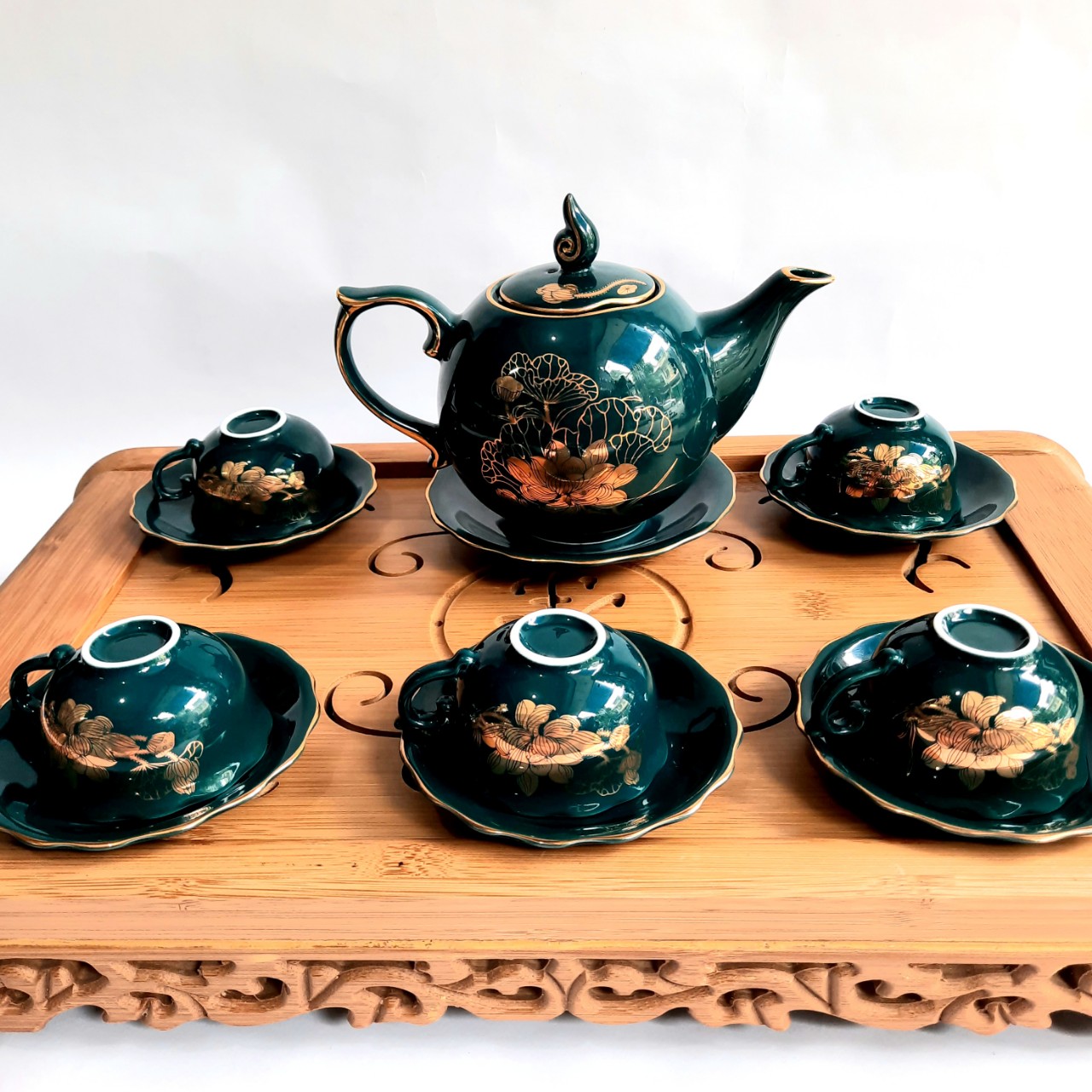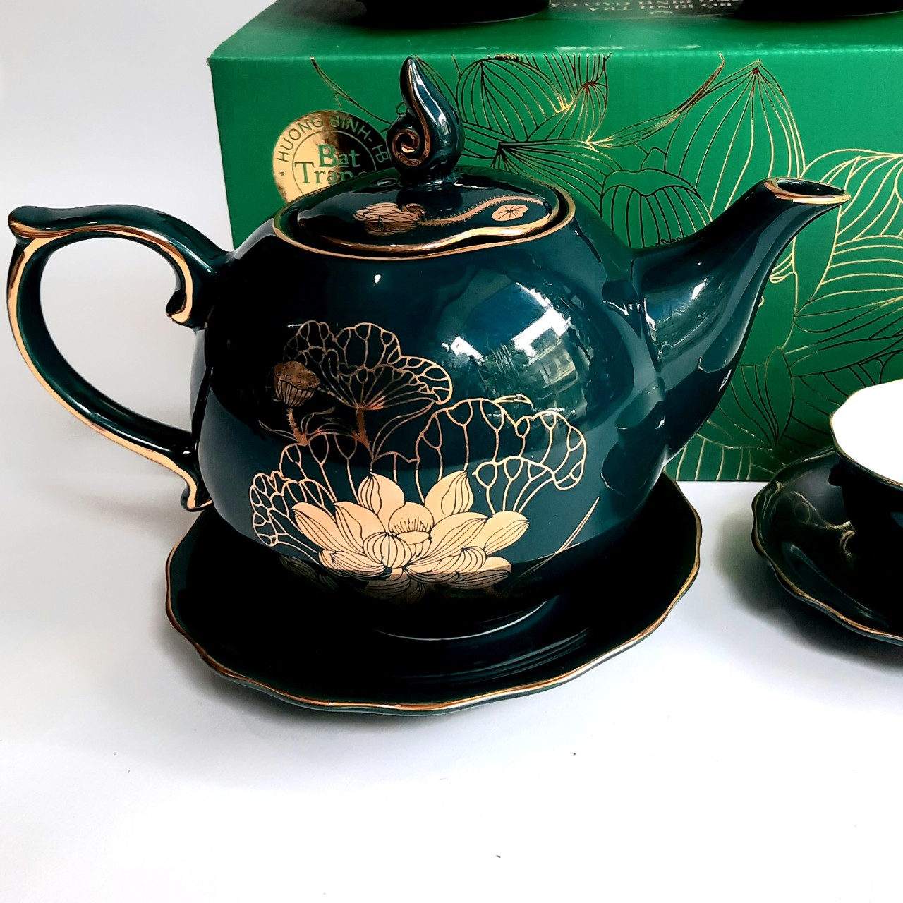 ✨Bộ ấm chén Bát Tràng cao cấp phú quý Mallard màu xanh Arctic họa tiết hoa sen vẽ vàng 24k