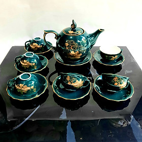 Bộ ấm chén Phúc Lộc Thọ dáng chóp men lục bảo vẽ vàng Gốm sứ Bát Tràng cao cấp Dung tích 430ml 1 ấm 6 chén 7 đĩa kê giá 650k