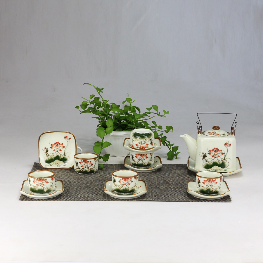 Bộ sản phẩm bao gồm: 1 ấm trà, 1 đĩa ấm, 6 chén trà, 6 đĩa chén Hoa sen là biểu tưởng đẹp về đức tính con người Việt: mạnh mẽ vươn lên, không