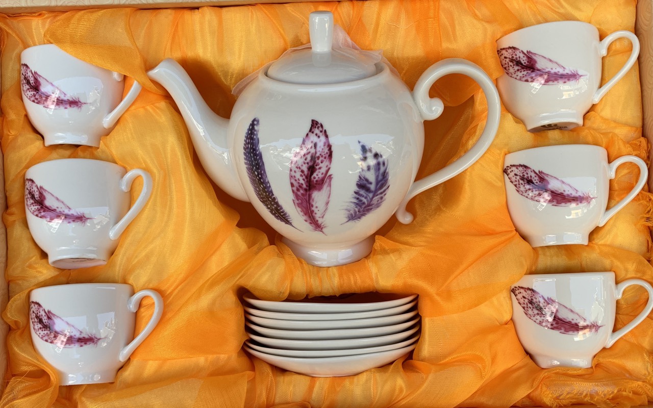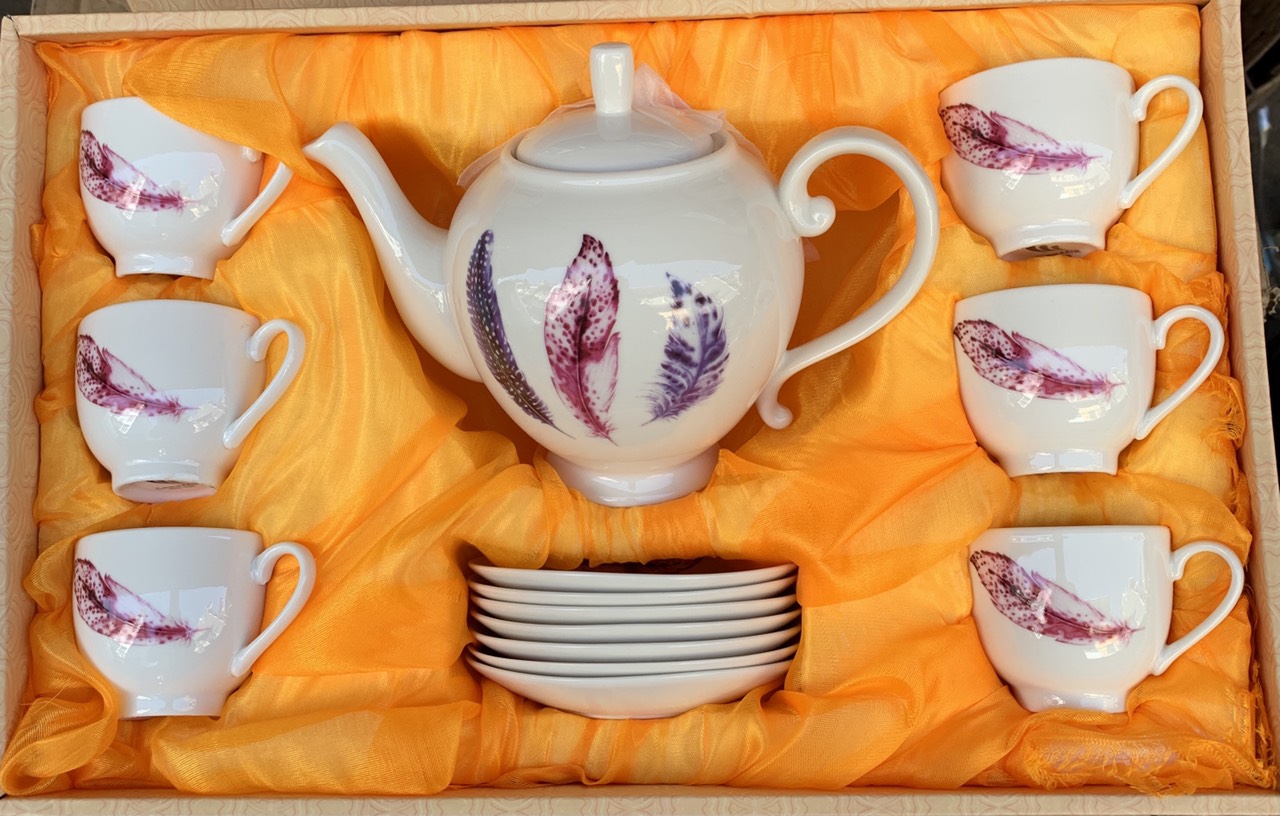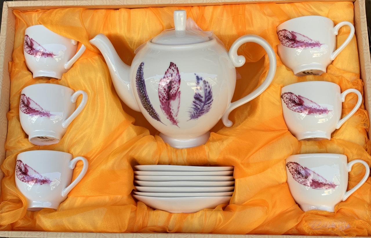 Một bộ sản phẩm bao gồm: 01 ấm, 01 đĩa ấm, 06 chén và 06 đĩa chén. Bộ sản phẩm được làm từ chất liệu gốm cao cấp, bảo đảm an toàn vệ sinh