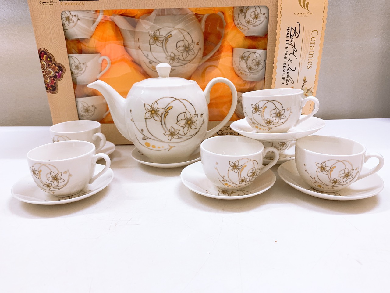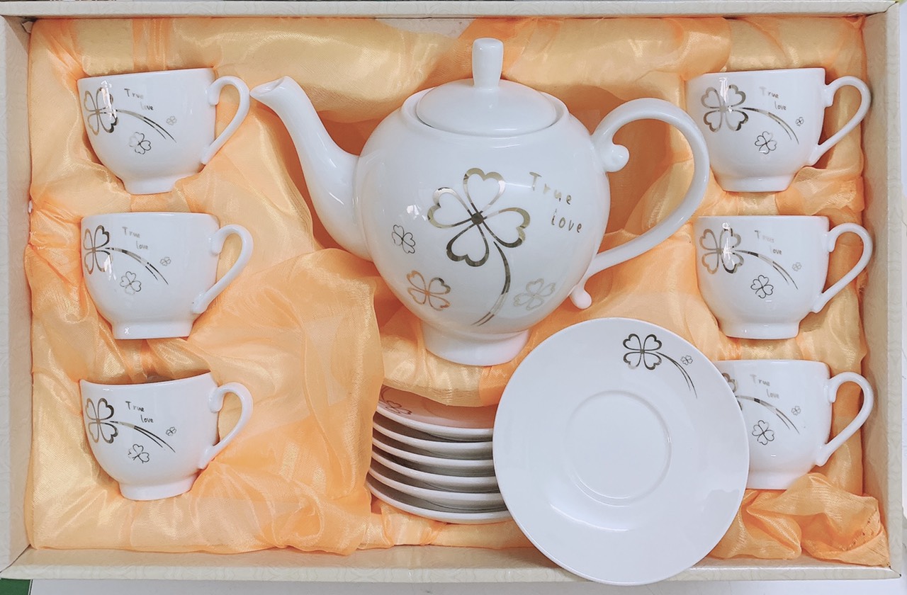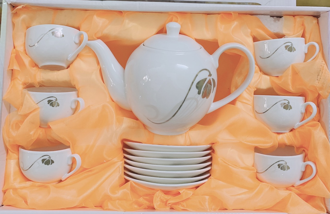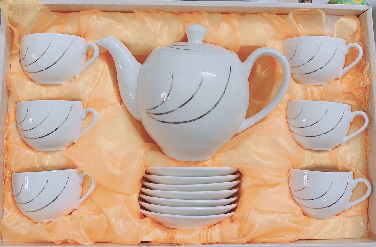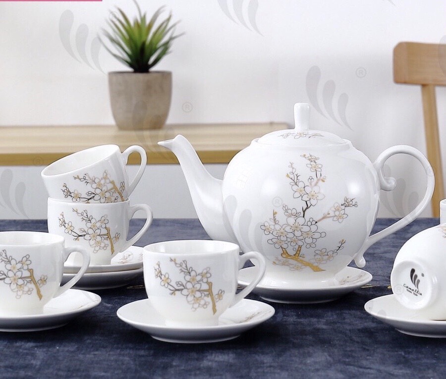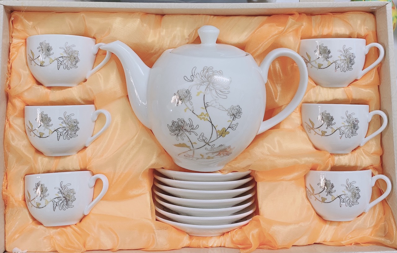 Một bộ sản phẩm bao gồm: 01 ấm, 01 đĩa ấm, 06 chén và 06 đĩa chén. Bộ sản phẩm được làm từ chất liệu gốm cao cấp, bảo đảm an toàn vệ sinh